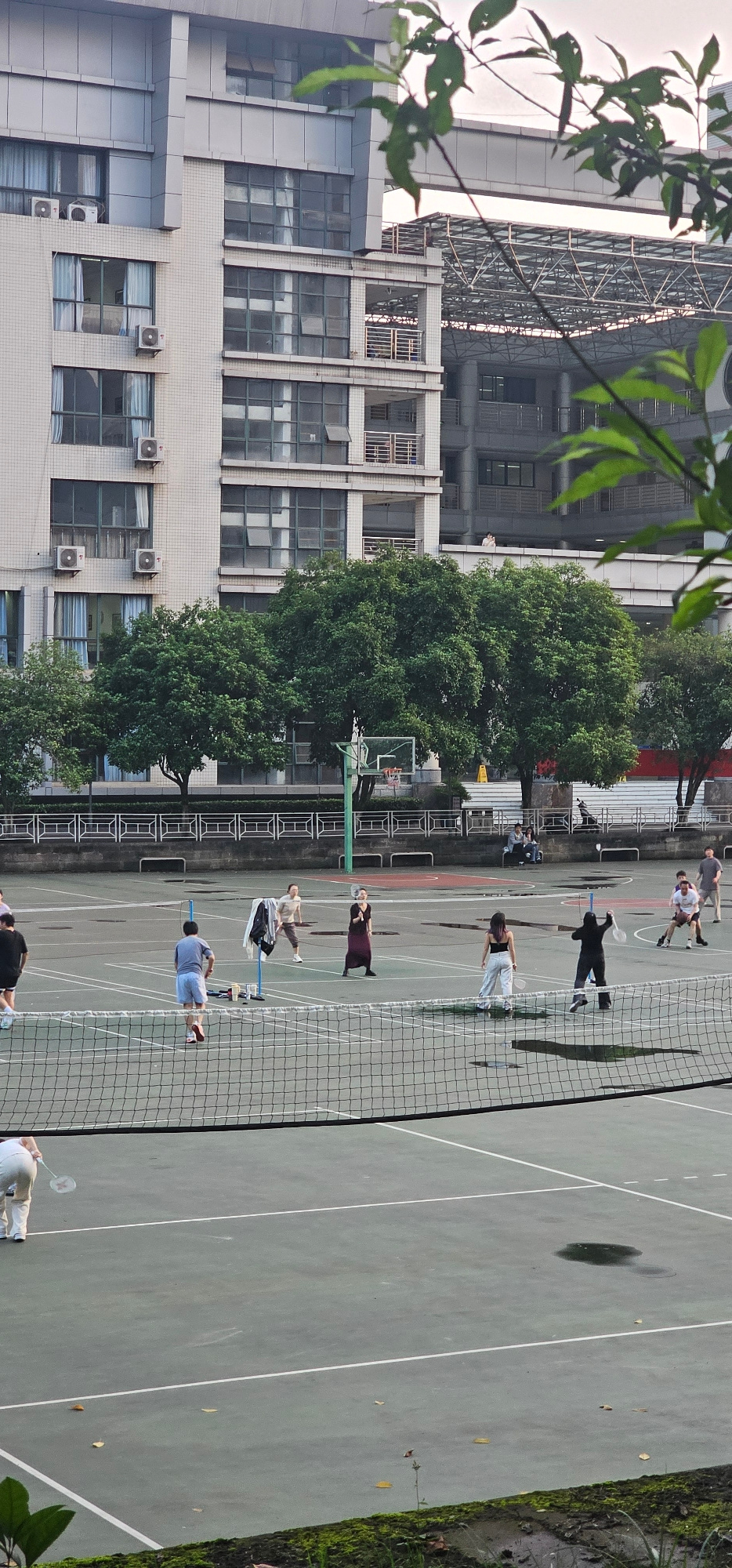 Yuzhong District, China. Exterior view of a public tennis court with people playing. The court is surrounded by a fence and trees. In the background, there is a building. Several people are standing o…read more