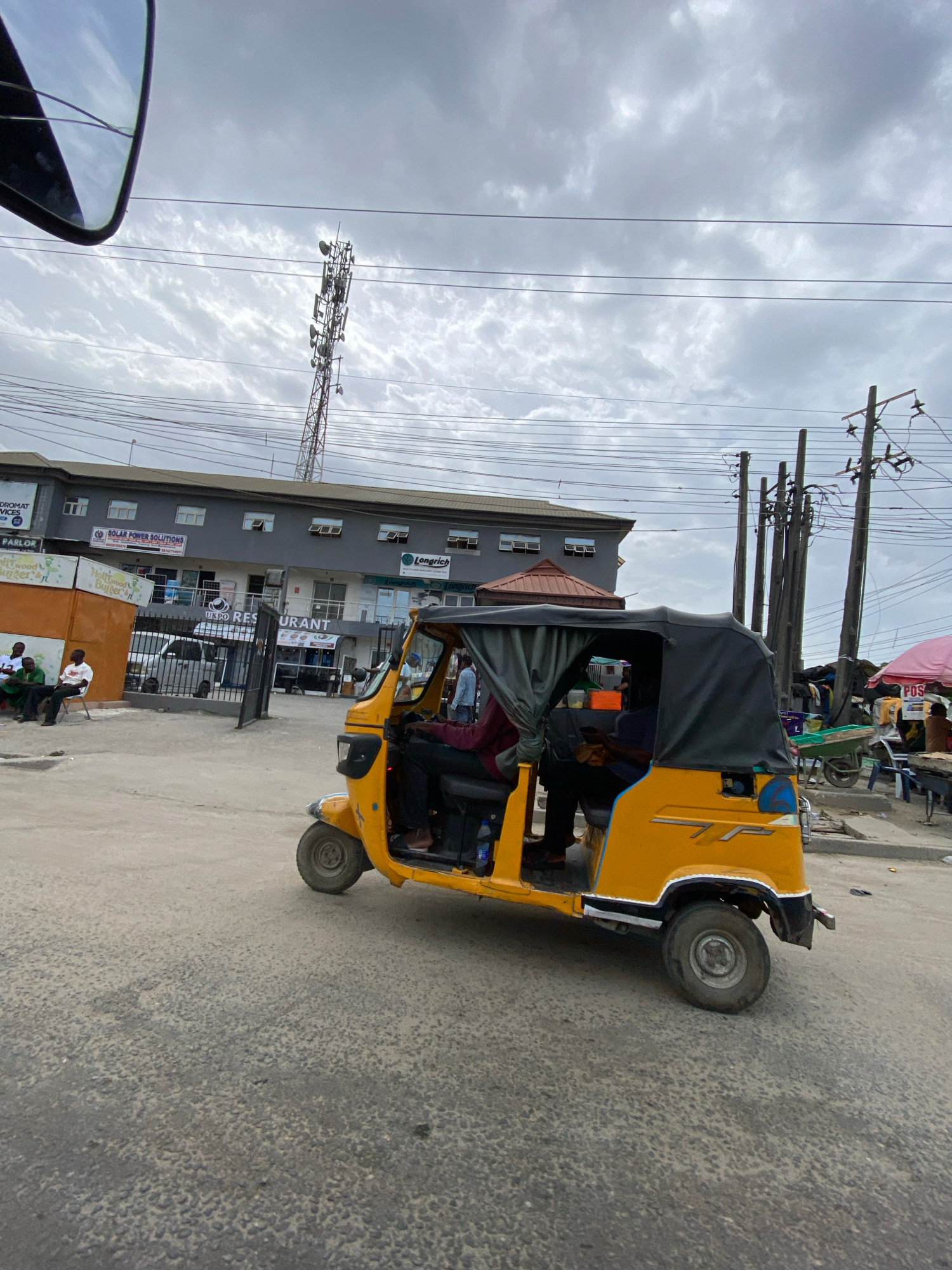 The image depicts a yellow "keke" (tricycle taxi) on a road in Ado, Nigeria, with passengers inside. The background includes a multi-story building with signs visible: "SOLAR POWER SOLUTIONS", "Hollywood Burger", "Longrich", and "Restaurant". There are also advertisements on a painted wall near the bottom of the frame. Power lines and a communications tower are visible in the sky. Several people are standing or sitting on the sidewalk in front of the building. The sky is overcast. A side mirror of a vehicle is visible in the bottom left corner. | Open Wire