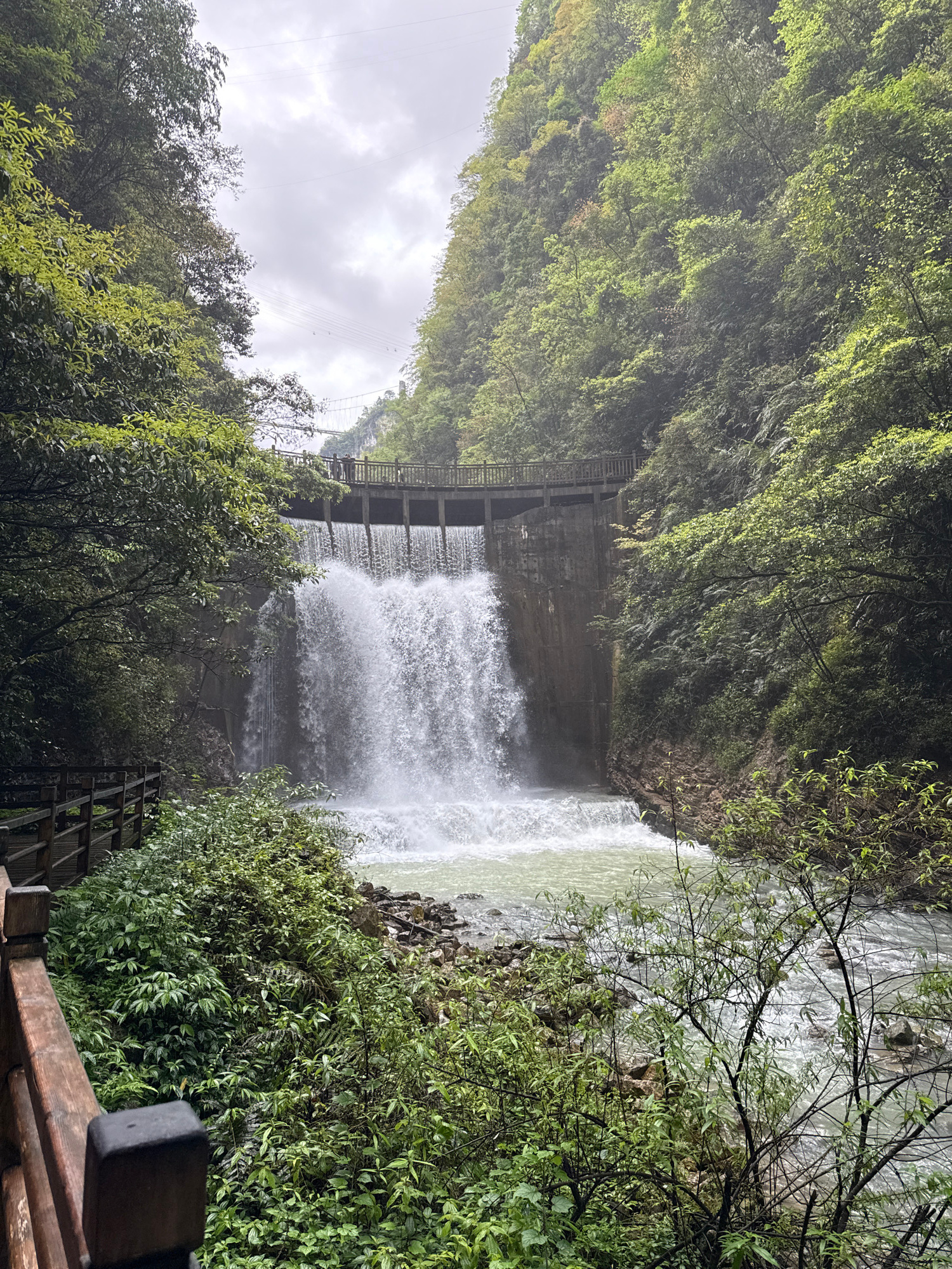 The image depicts a waterfall cascading over a dam-like structure, framed by lush green vegetation on both sides. The sky is overcast. A wooden fence is visible in the lower right corner. The location…read more