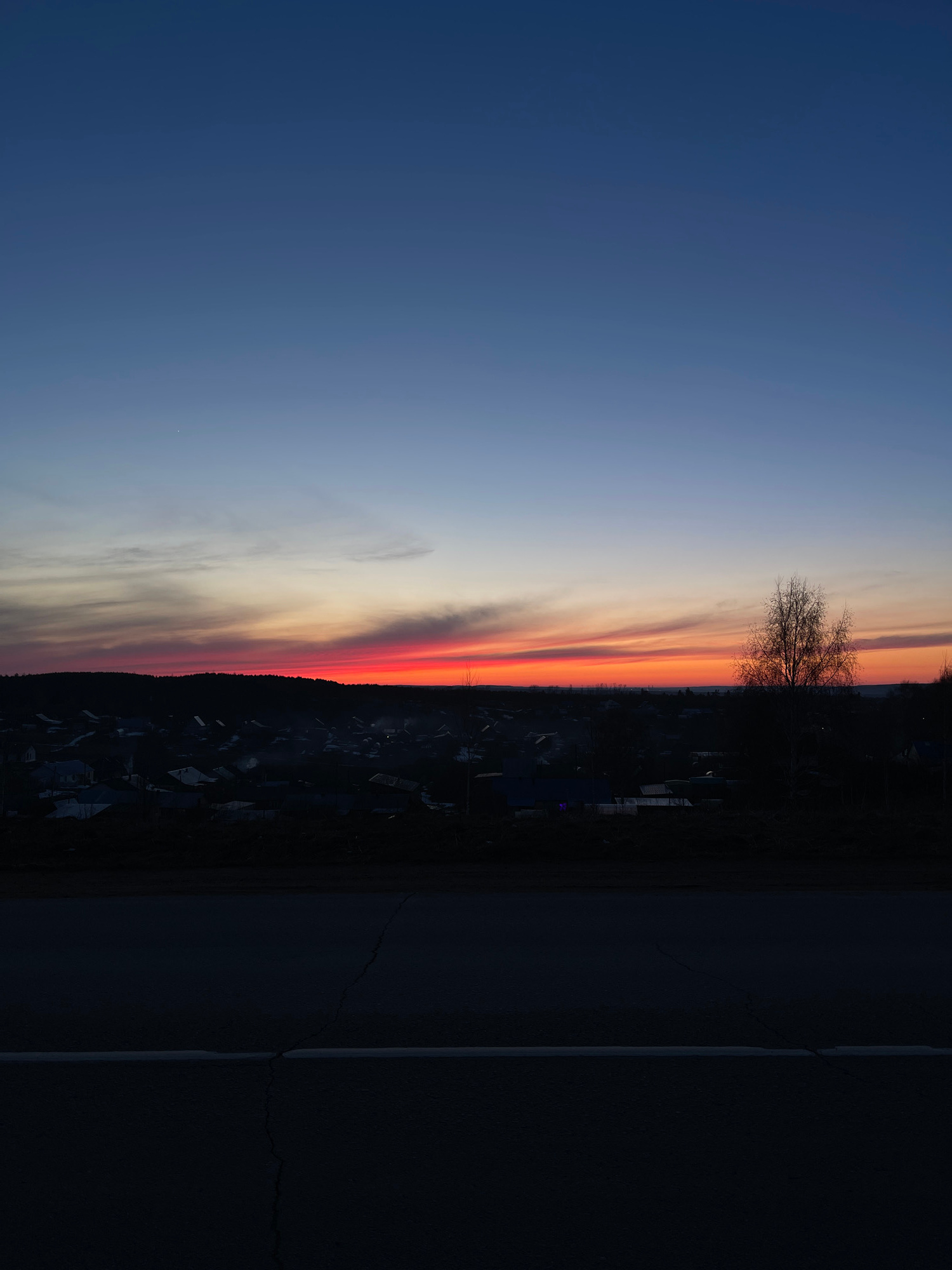 The image depicts a sunset scene in Фоки, Russia. The sky transitions from a deep blue to hues of orange and red near the horizon, where striated clouds are visible. Silhouetted against the sunset is…read more