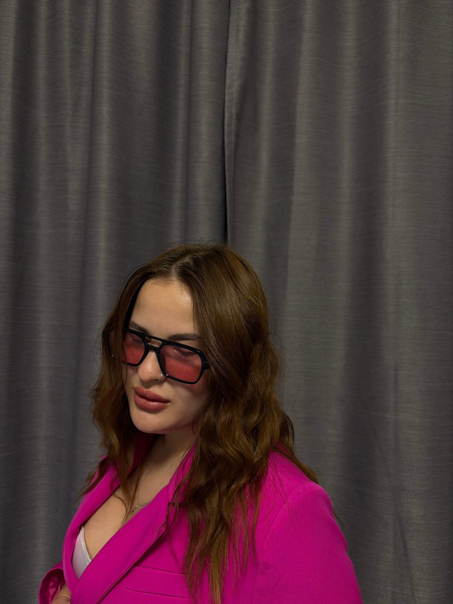A woman with brown hair and wearing black glasses is positioned against a grey curtain background. She is wearing a bright pink blazer, exposing a white undergarment. The photo appears to be taken indβ¦read more