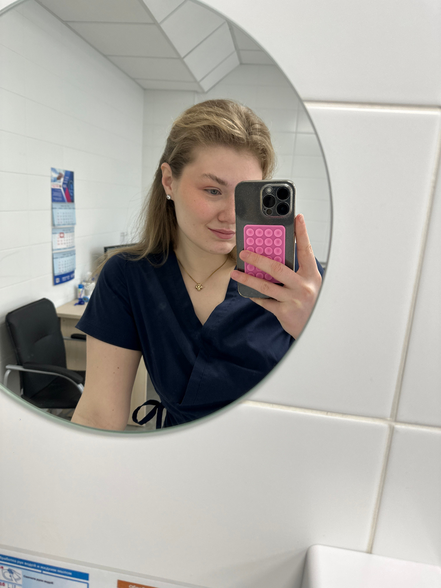 A woman is taking a selfie in a mirror. The mirror is round and framed. She is holding a phone with a gray case and a pink "pop-it" style attachment. She is wearing a dark blue scrub top and a gold ne…read more