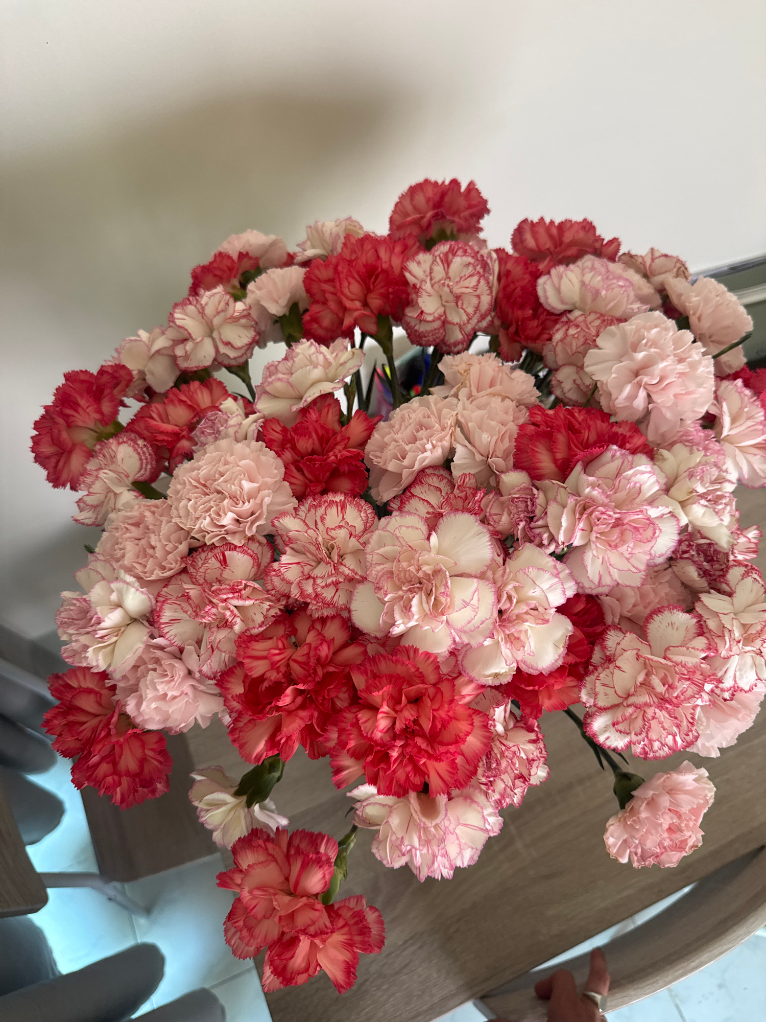 A dense floral arrangement, composed of numerous carnations in shades of solid pink, solid red, and bi-colored white with red margins, occupies the central and upper portions of the image. The flowers…read more