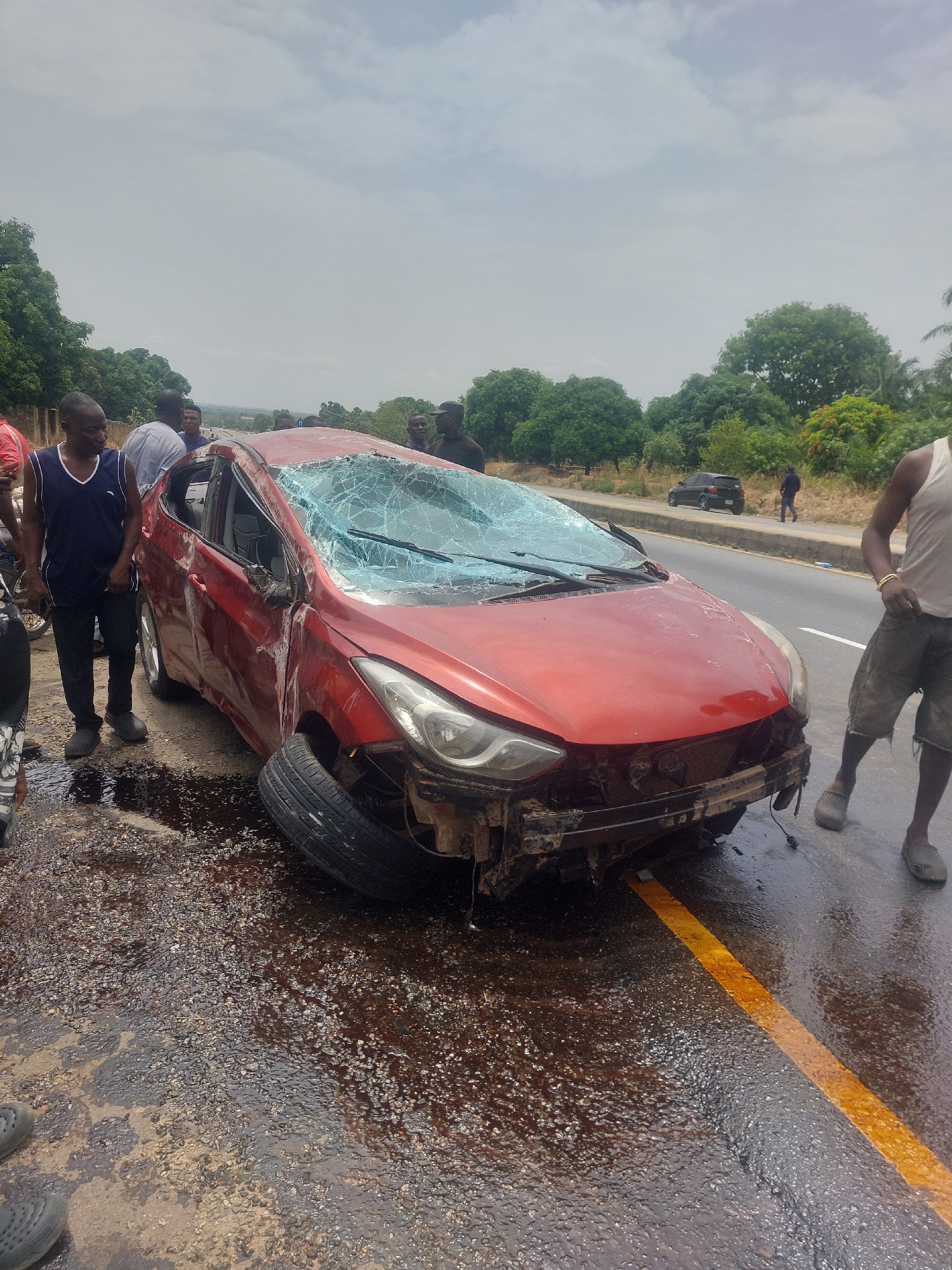 A red sedan is severely damaged in a car accident on a paved road. The windshield is cracked, and the front end of the car is heavily damaged, with the front tire detached. A yellow dividing line is v…read more