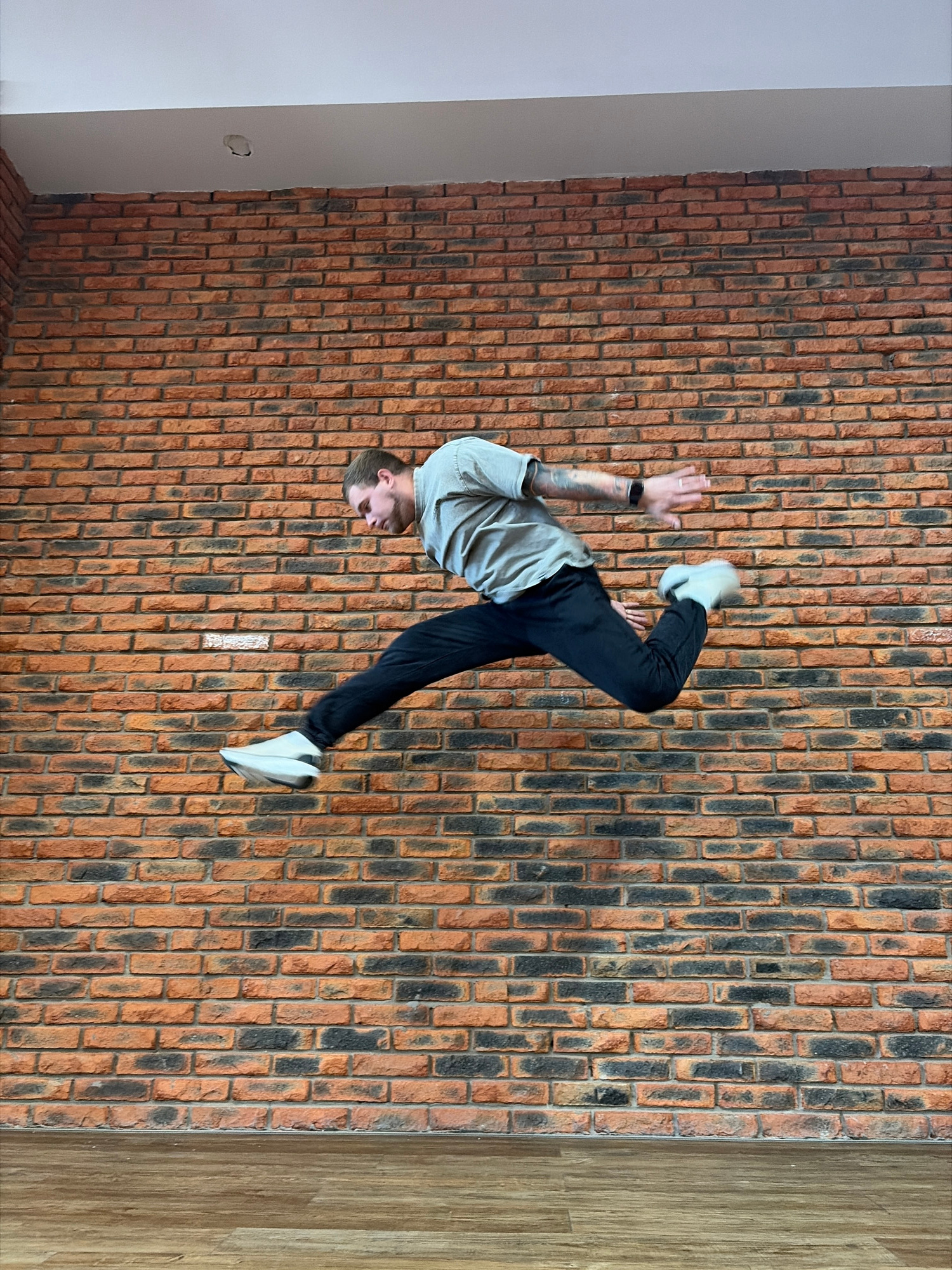 An inverted full-shot captures a young man performing an acrobatic pose, possibly a handstand or a partial flip, against a textured brick wall in an indoor setting in Chaikovsky, Russia. The man, with…read more
