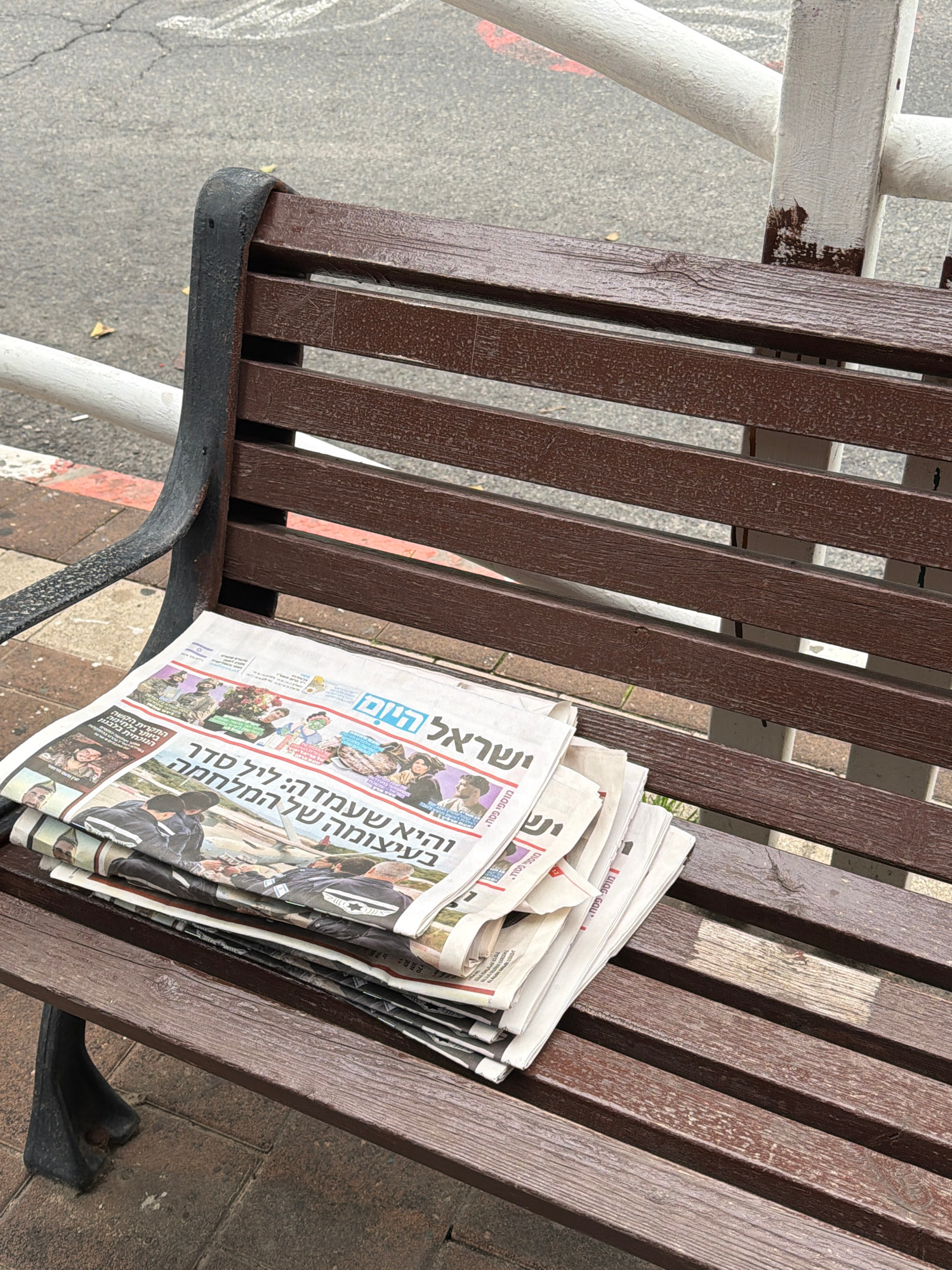 The image captures a stack of newspapers resting on a brown wooden bench. The newspapers are in Hebrew, with one cover visibly displaying the title "Israel Hayom" (Israel Today) and a headline mention…read more