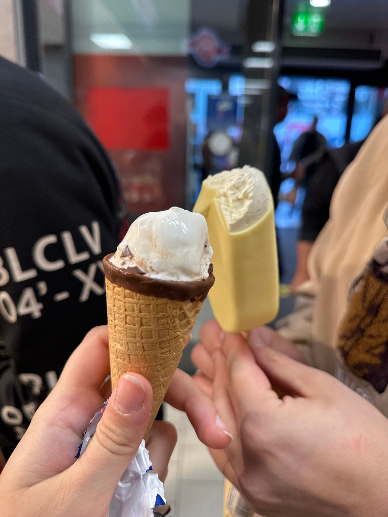 A low-angle, close-up shot shows two ice creams being held. In the foreground, a person holds a cone ice cream with white ice cream and a chocolate-covered rim. The ice cream is partially unwrapped. B…read more