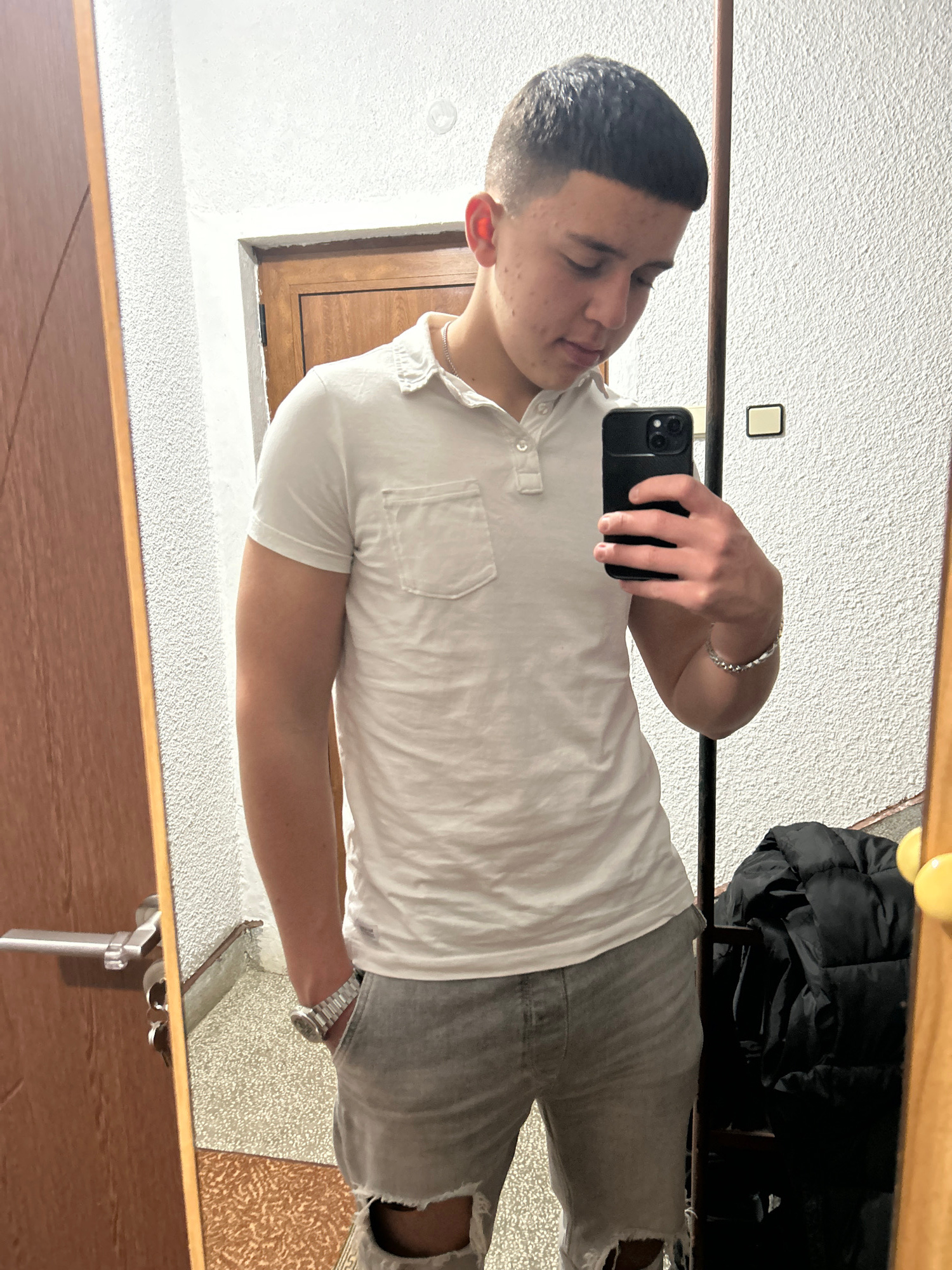 A young man is taking a selfie in a mirror. He is wearing a white polo shirt, gray jeans, and a watch on his left wrist. He has short, dark hair. He is holding a black smartphone in his right hand. Th…read more