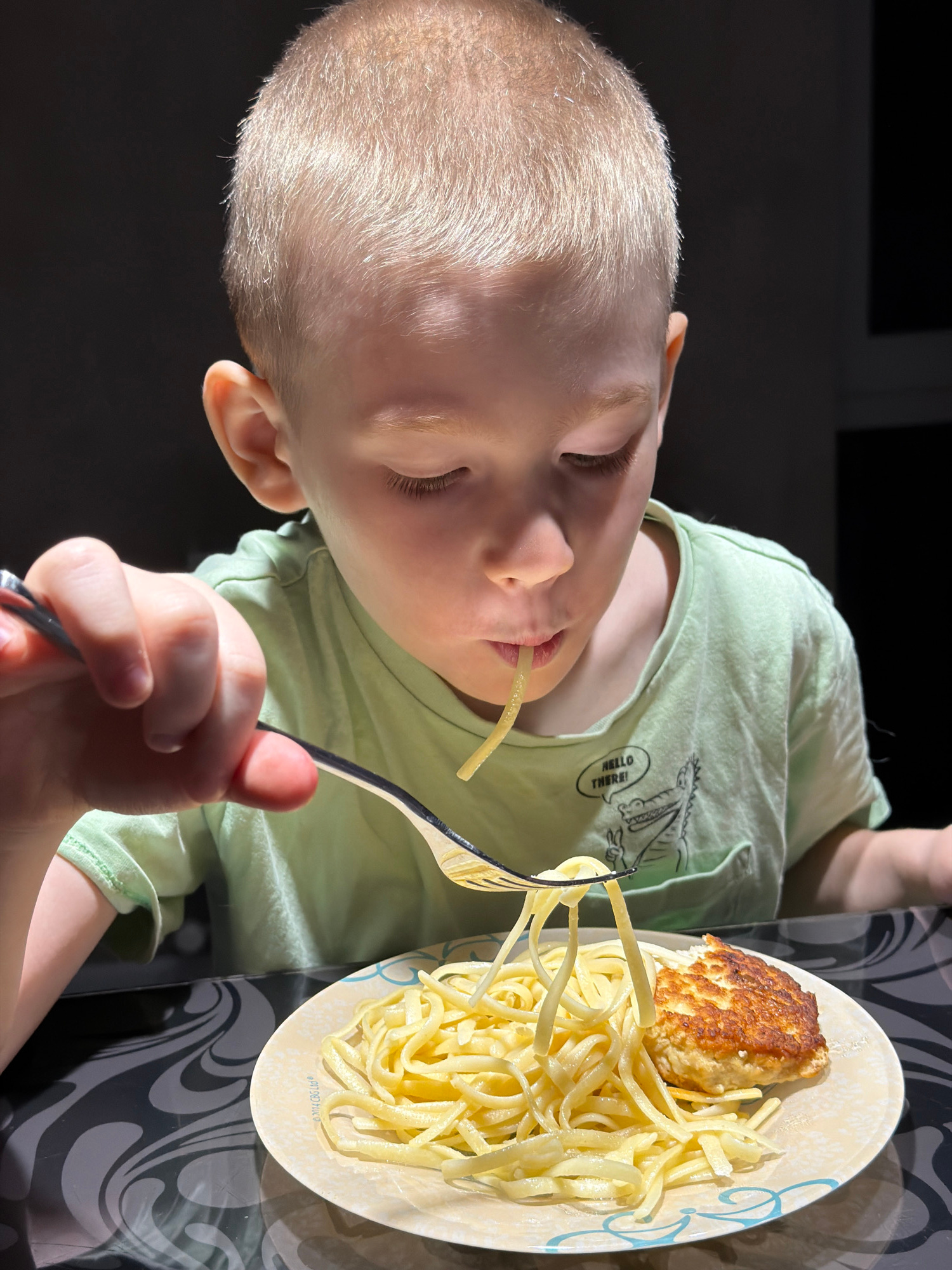 A young boy with blonde hair is eating noodles and a meat patty from a plate at a table. The scene appears to be indoors with a dark background. No specific location information is discernible beyond…read more