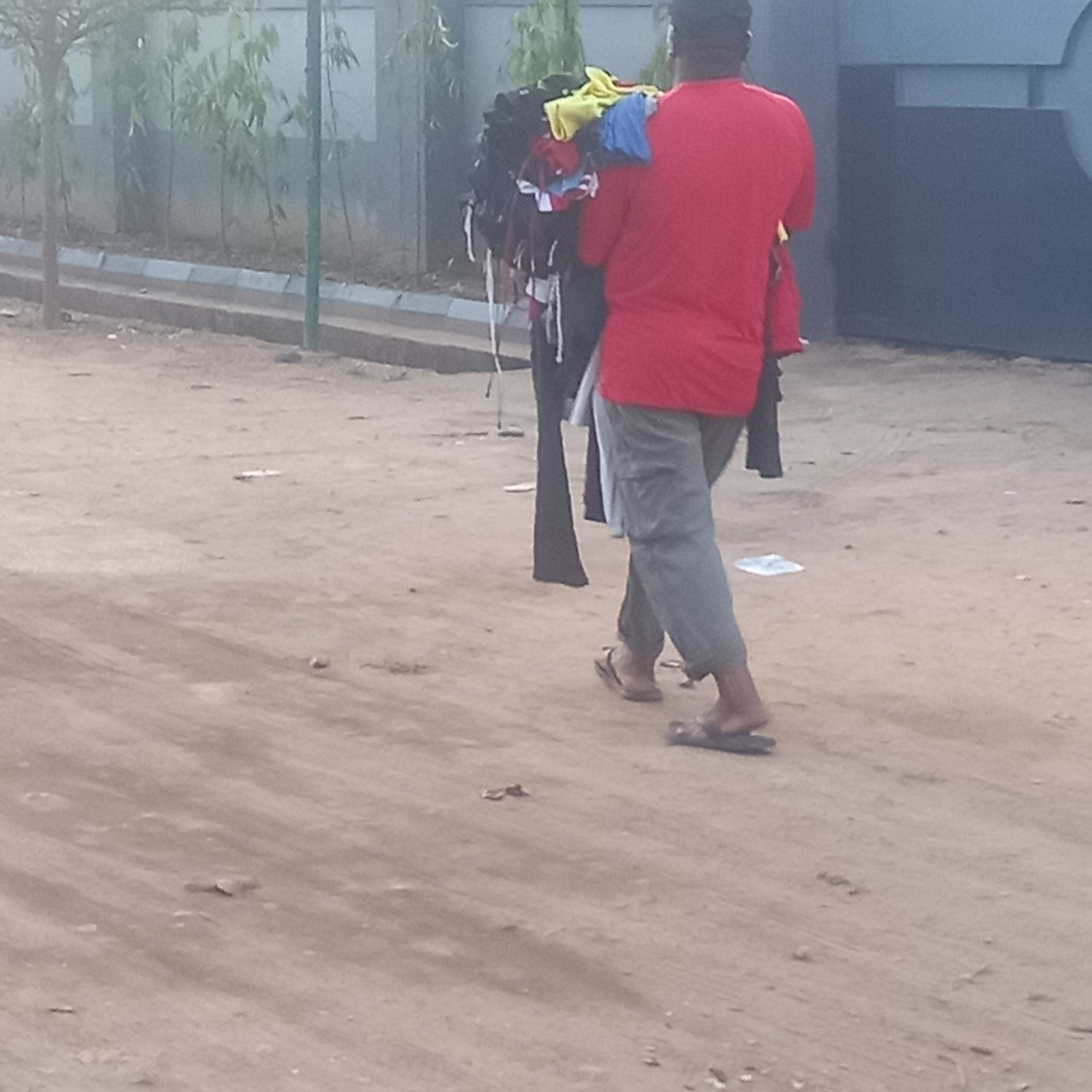 A man in a red shirt and grey pants walks on a dirt surface in Dadi Riba, Nigeria. He carries a load of clothing and items on his back and wears sandals. Adjacent to the walking surface is a landscape…read more