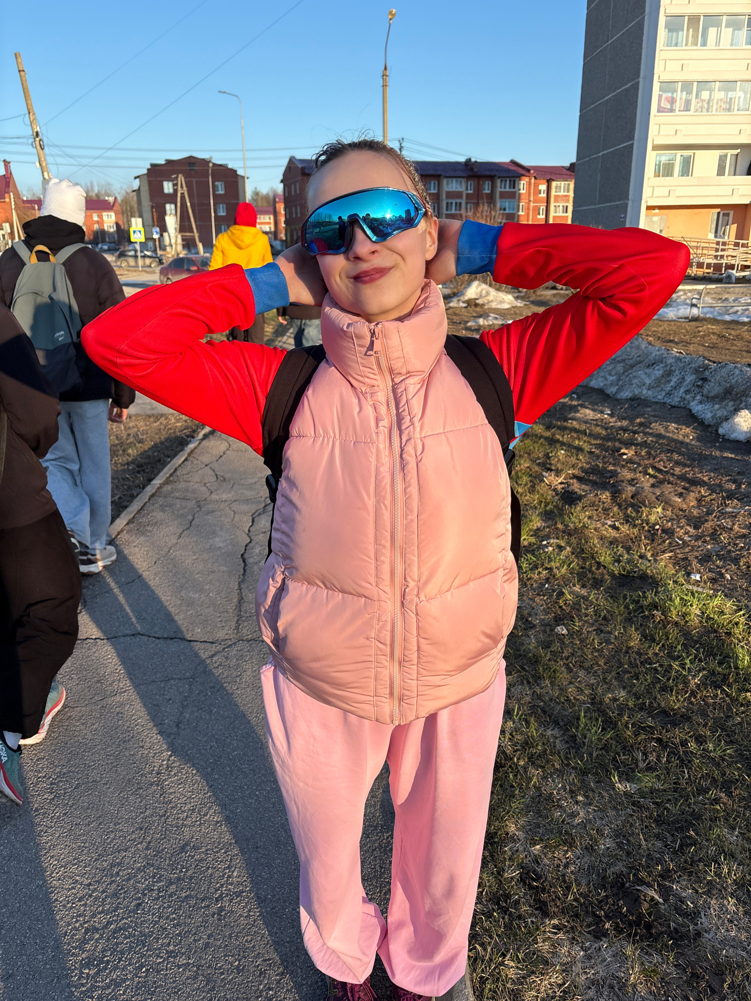 A young girl with fair skin and hair pulled back in a bun is the primary subject of this outdoor photograph. She is wearing mirrored blue sunglasses, a pink puffer vest over a red long-sleeved shirt w…read more