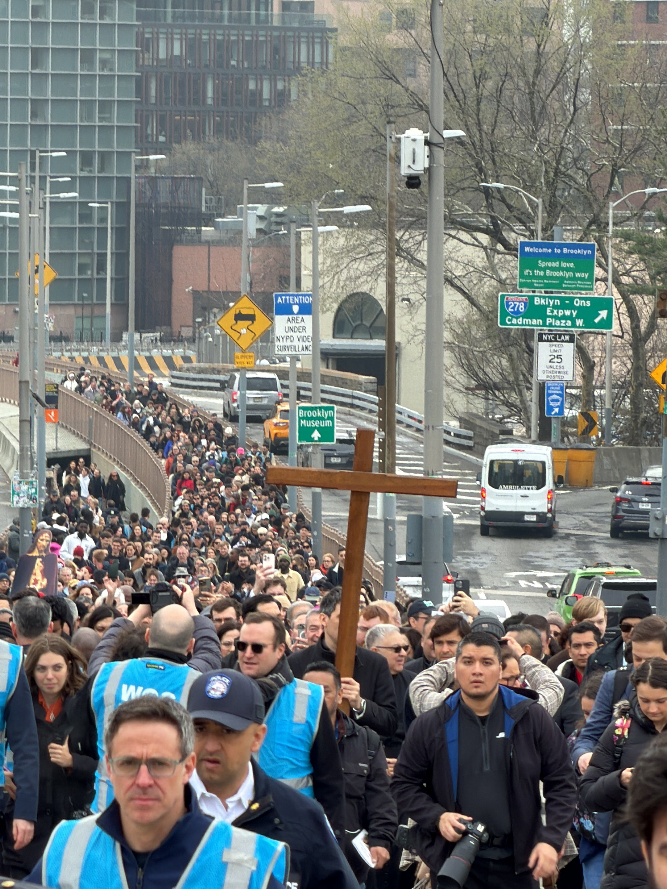 A large crowd of people is gathered on the Brooklyn Bridge in New York City. A person in the foreground is carrying a wooden cross. Traffic signs are visible overhead, and buildings are in the backgro…read more