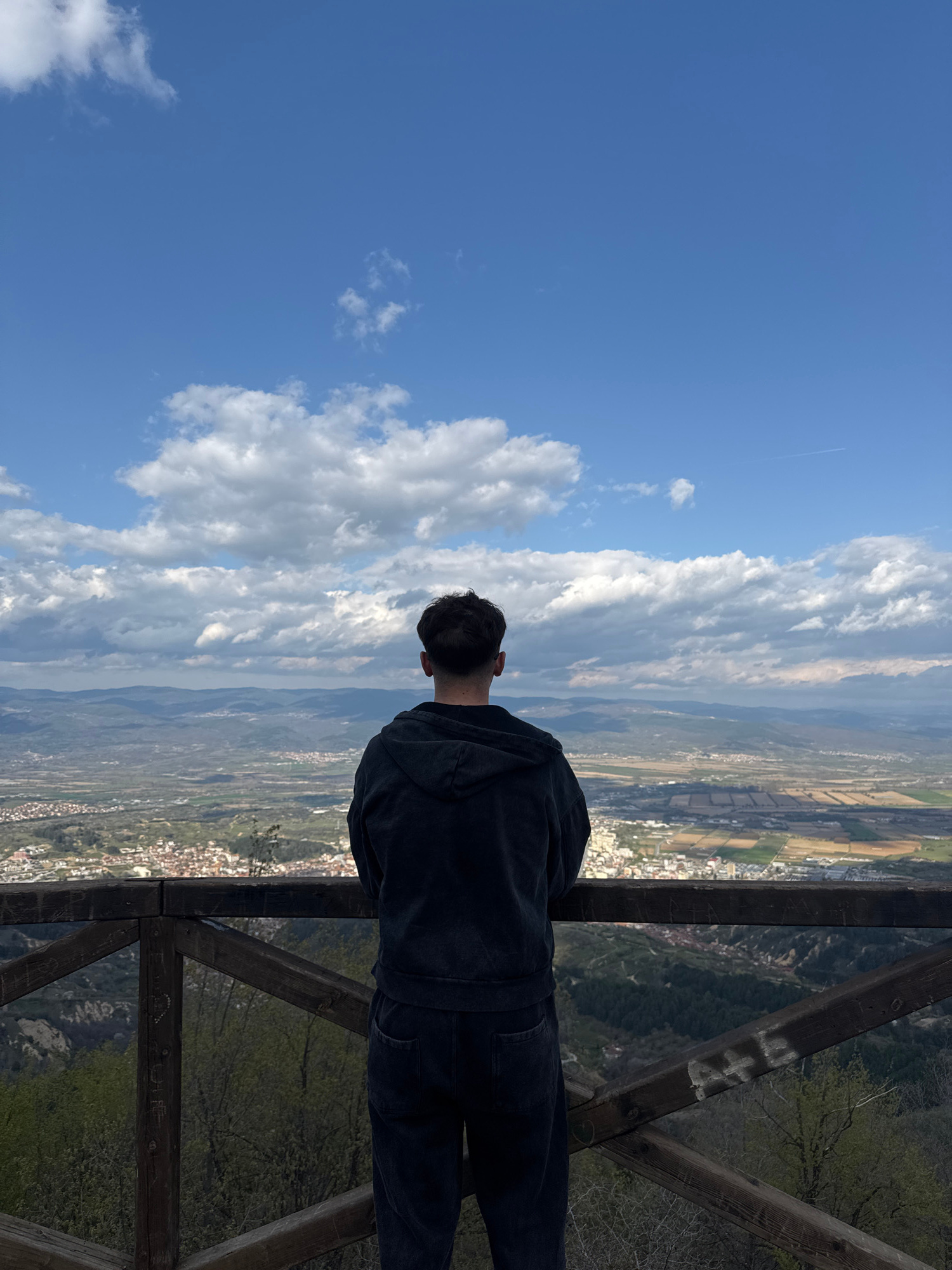 The image shows a person standing on a wooden observation deck, gazing out at a landscape. The person is wearing a dark-colored jacket and dark pants, and only the back of their head and upper body ar…read more