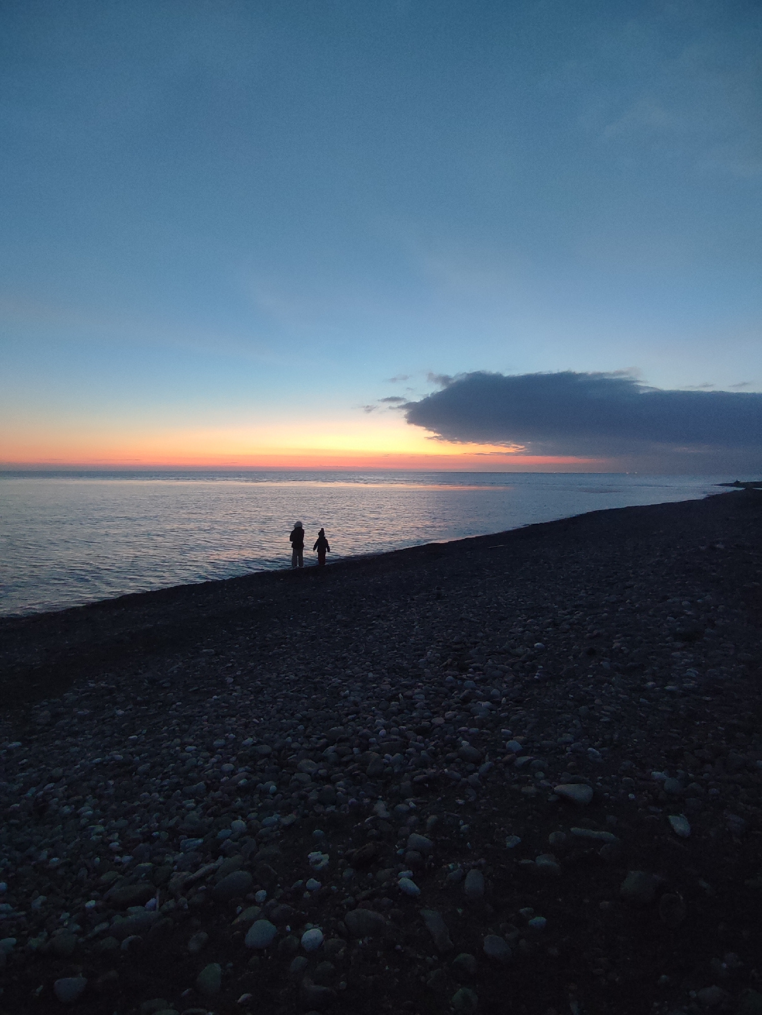 The image depicts a twilight scene on a pebble beach in Sirius, Russia. Two figures stand near the water's edge. A body of water, presumably the Black Sea, stretches to the horizon where a colorful su…read more