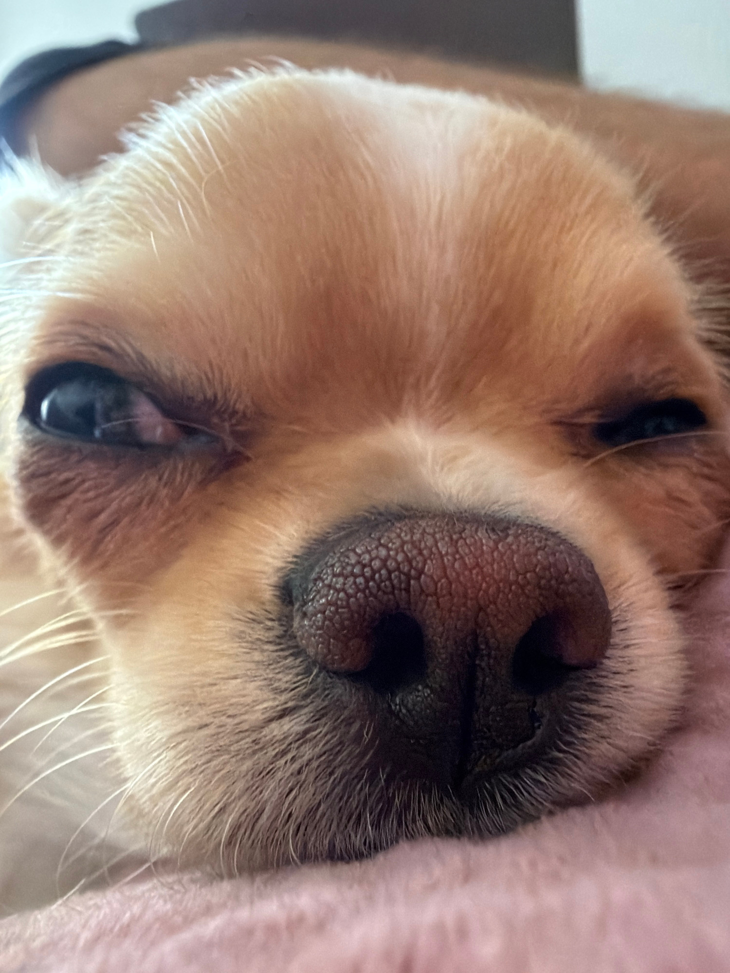 A close-up shot depicts a chihuahua dog resting its head on a light pink surface. The dog's fur is a blend of tan and cream hues. Its nose is dark brown and textured. The dog's eyes are barely visibleβ¦read more