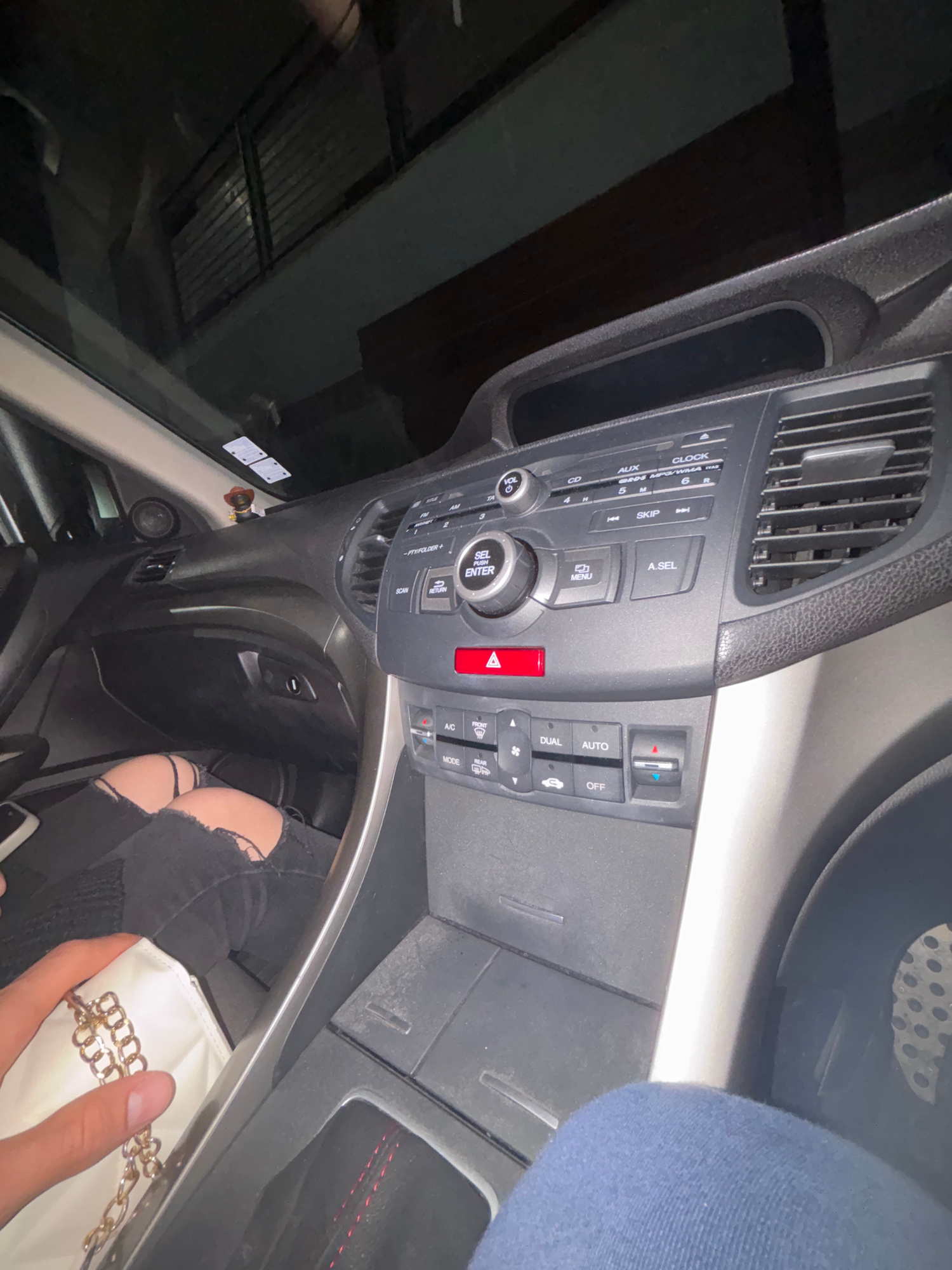 The image shows the interior of a car. The dashboard is visible, featuring the car's infotainment system and climate control panel. A person wearing ripped black jeans is holding a white purse with a…read more