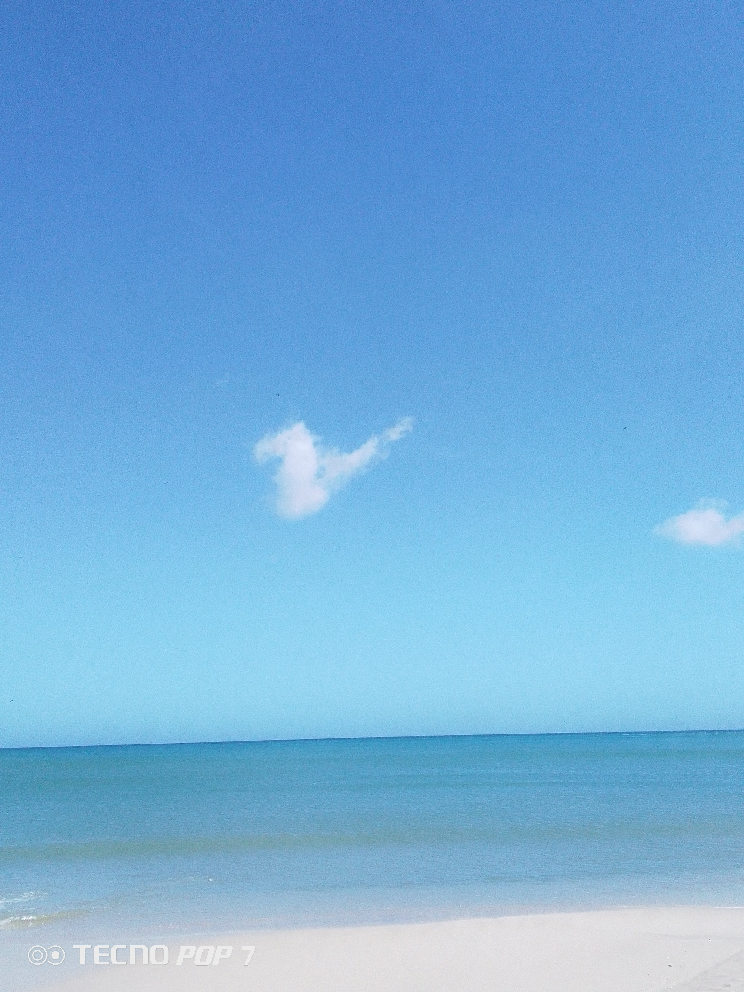 The image shows a tranquil beach scene. The sky is predominantly blue with a few scattered white clouds. The ocean is calm, with a gradient of turquoise hues. The beach sand is light-colored. The loca…read more