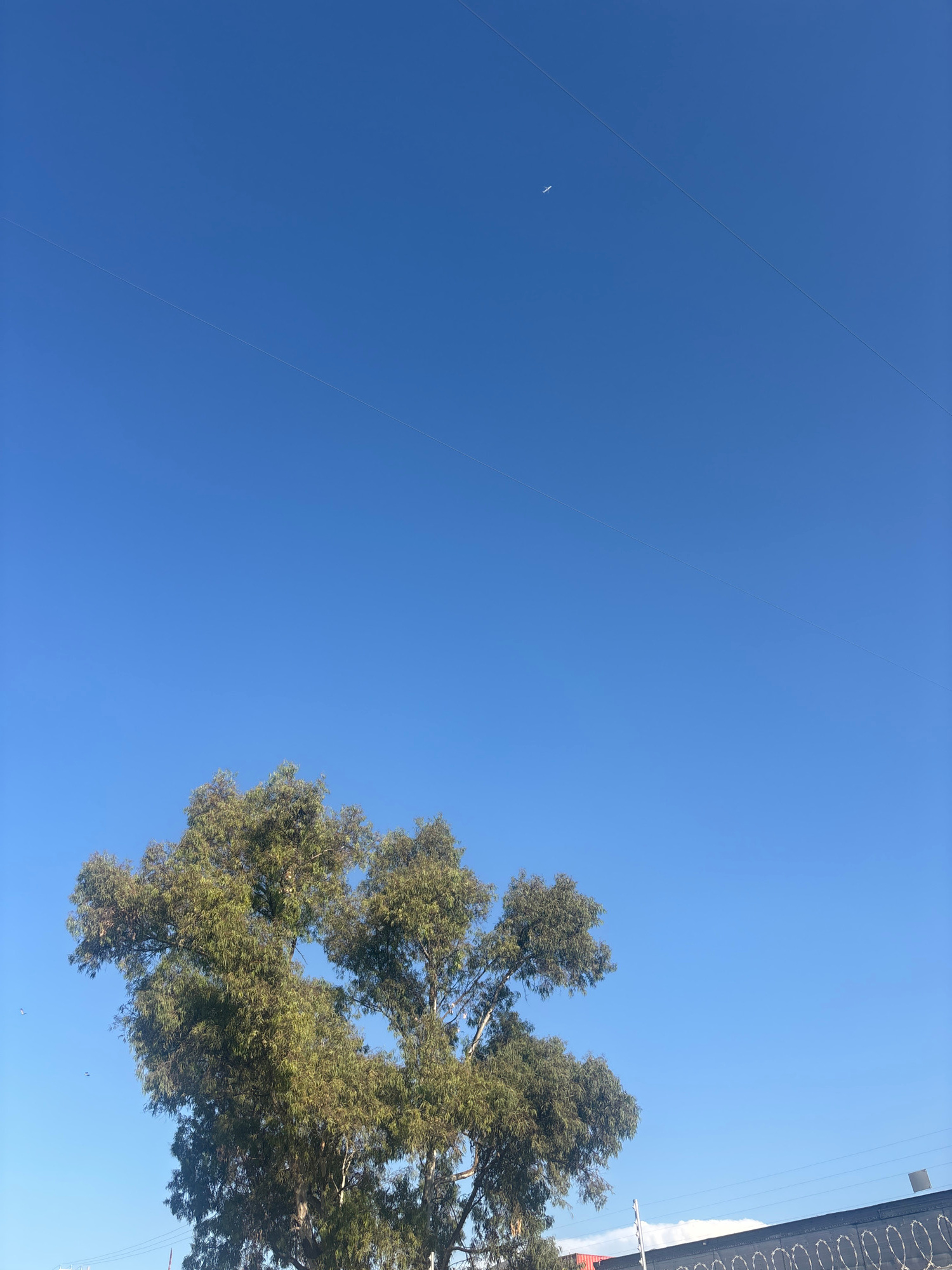 The image shows a clear, bright blue sky with a tree on the right side and power lines extending across the sky to the left. A small bird is visible flying in the lower right corner of the frame. Ther…read more