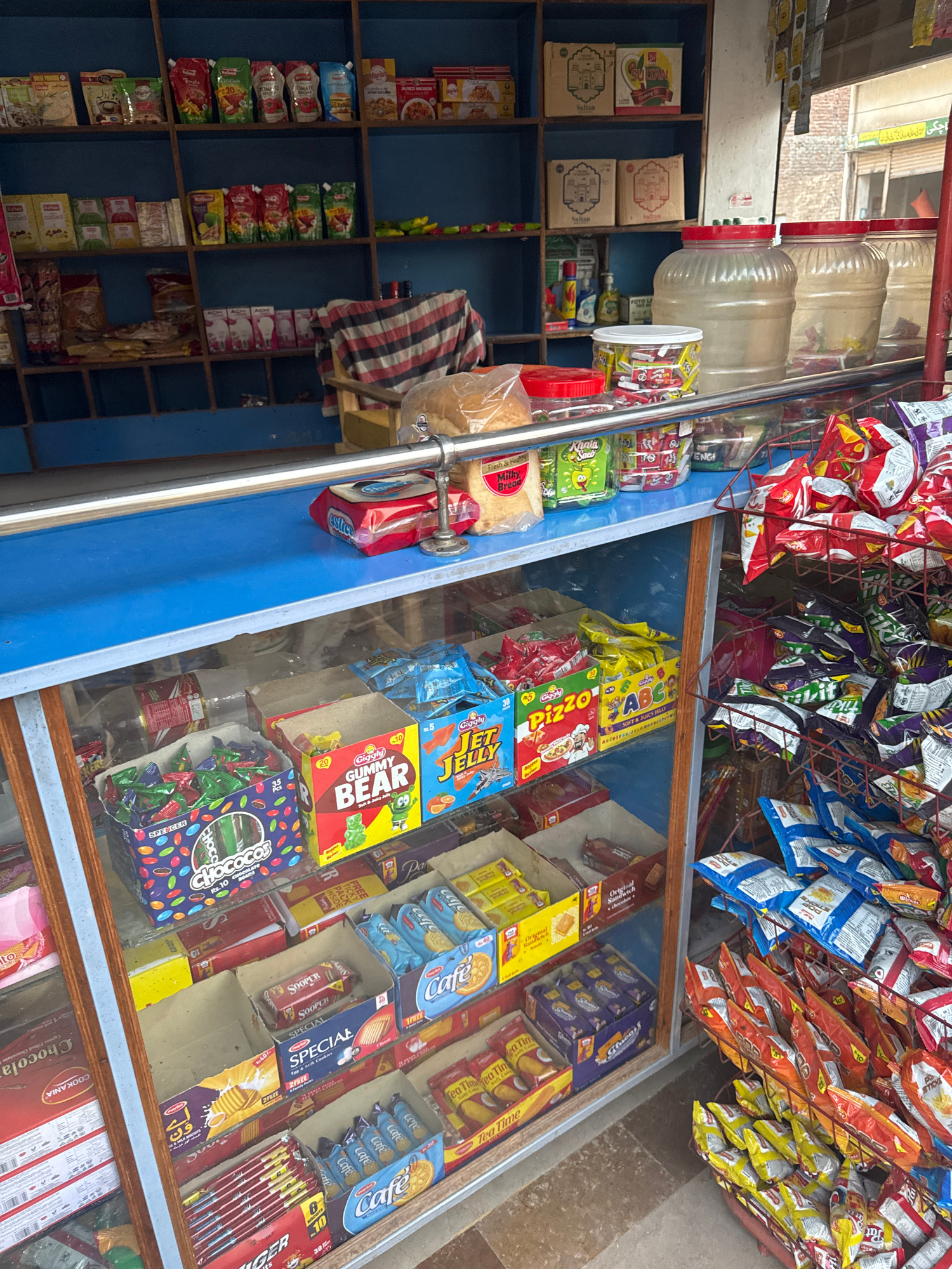 This is a photograph of a shop in Multan, Pakistan. The shop features shelves stocked with various items. These include packaged foods, such as biscuits and snacks, with recognizable brand names like…read more