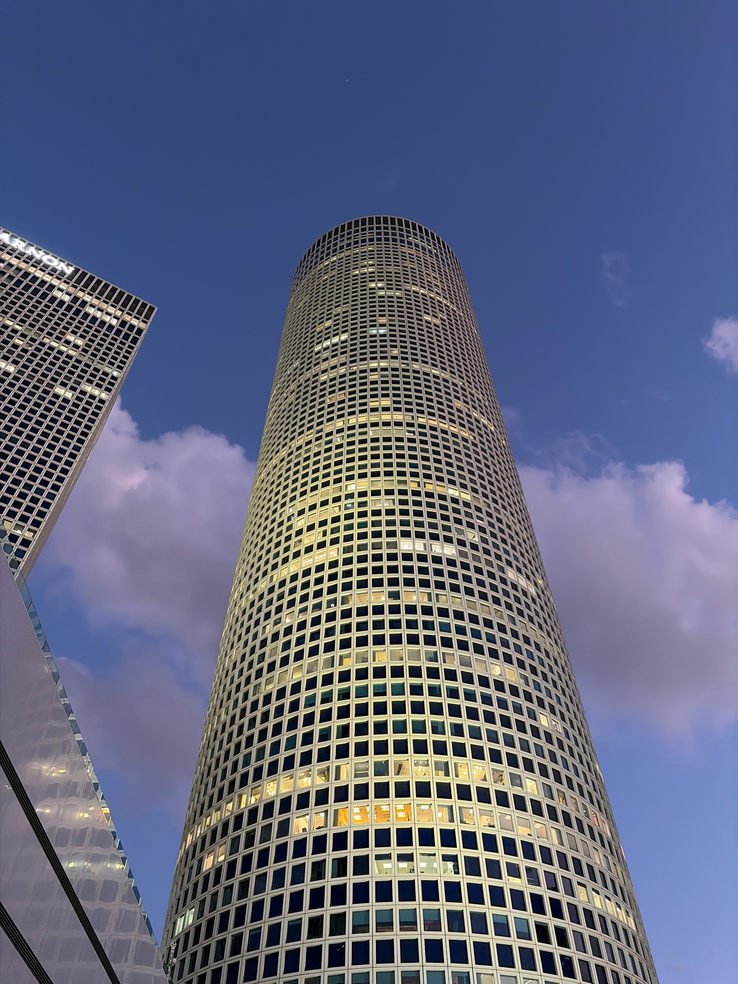 The image depicts a low-angle view of two modern skyscrapers in Givatayim, Israel, set against a dusk sky with scattered clouds. The primary building is a cylindrical tower with a grid-like facade ill…read more