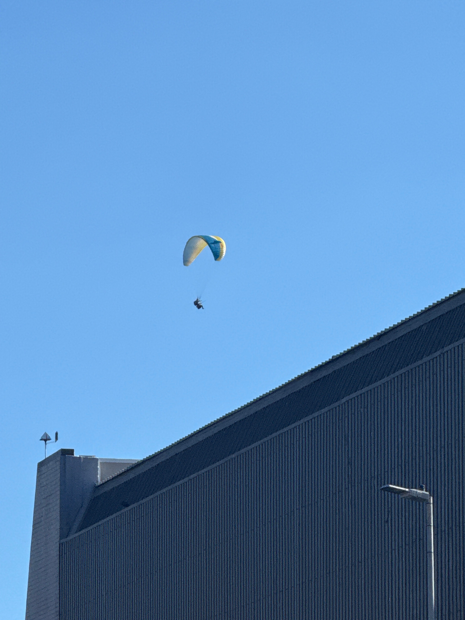 A powered paraglider flies near an unidentified building in Cape Town, South Africa. The building, seen in the upper right corner of the frame, has a corrugated metal roof and appears to be a large stβ¦read more