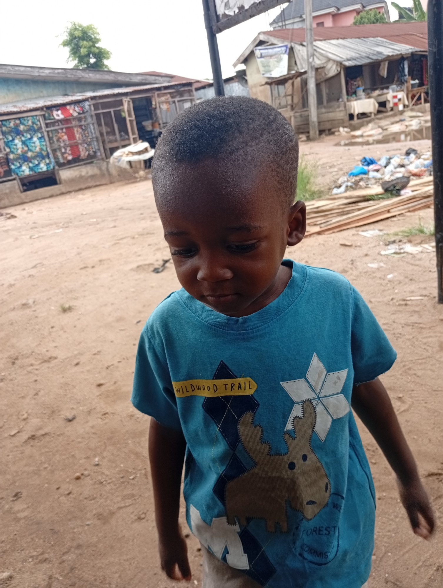 A young Black boy stands on a dirt ground, looking downwards with a subdued expression, in what appears to be a street or market area in Owerri, Nigeria. He has short, dark hair and is wearing a shortβ¦read more