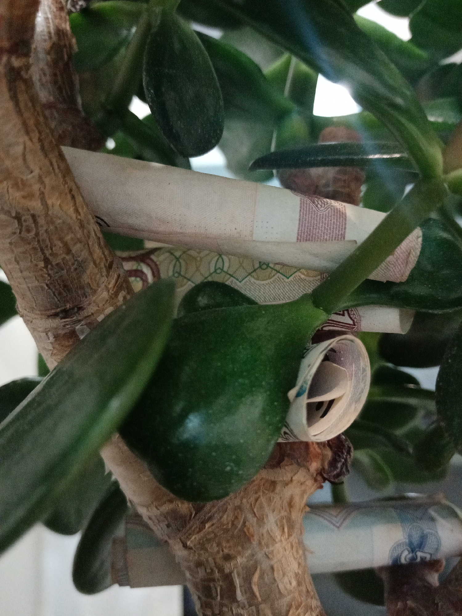 This image depicts a jade plant (Crassula ovata). Several rolled-up banknotes are tucked among the branches and leaves of the plant. Based on the visual characteristics of the banknotes, they appear t…read more