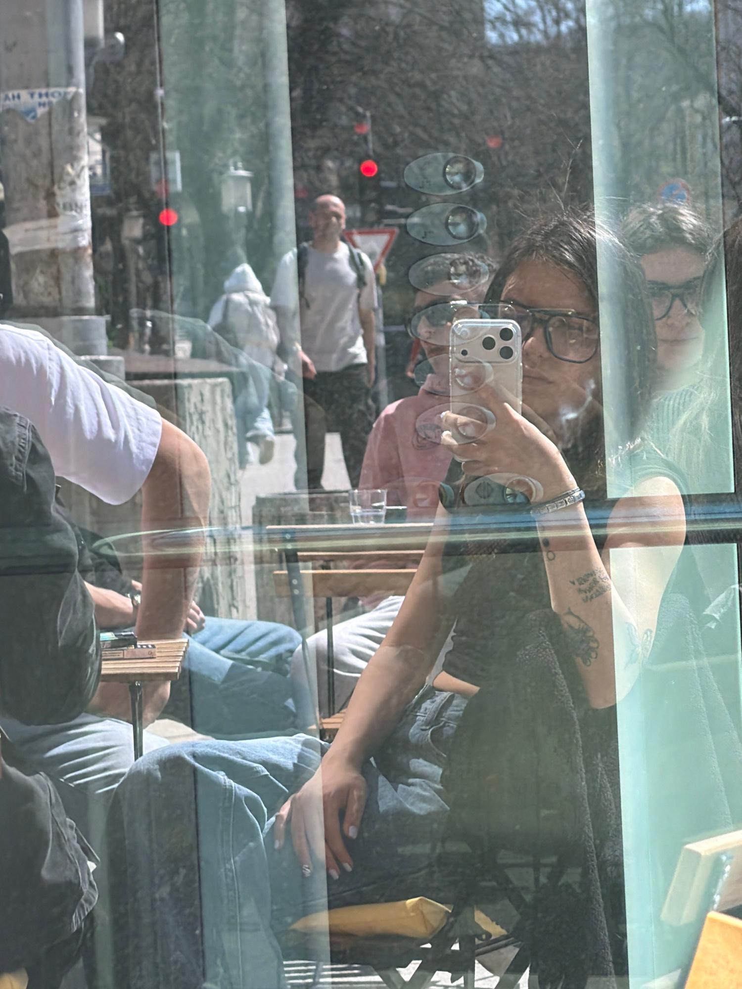 The image appears to be a reflection captured on a window or glass surface, creating a composite scene. The primary subject is a person, presumably female, wearing glasses and holding a smartphone up…read more