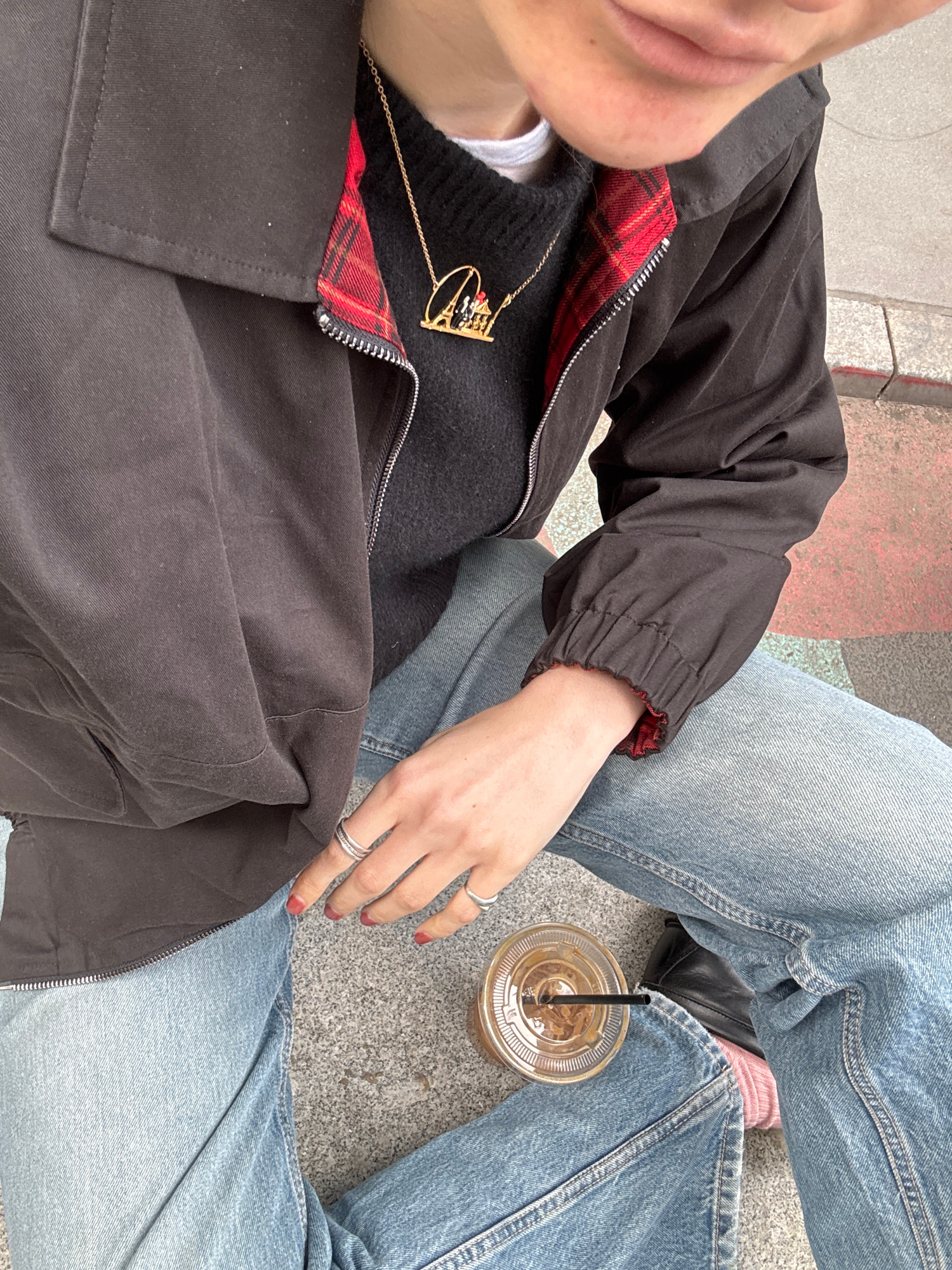 This close-up, high-angle shot captures two individuals seated outdoors in a relaxed, casual setting in New York, United States of America. In the foreground, one person is seen from the chest down,…read more