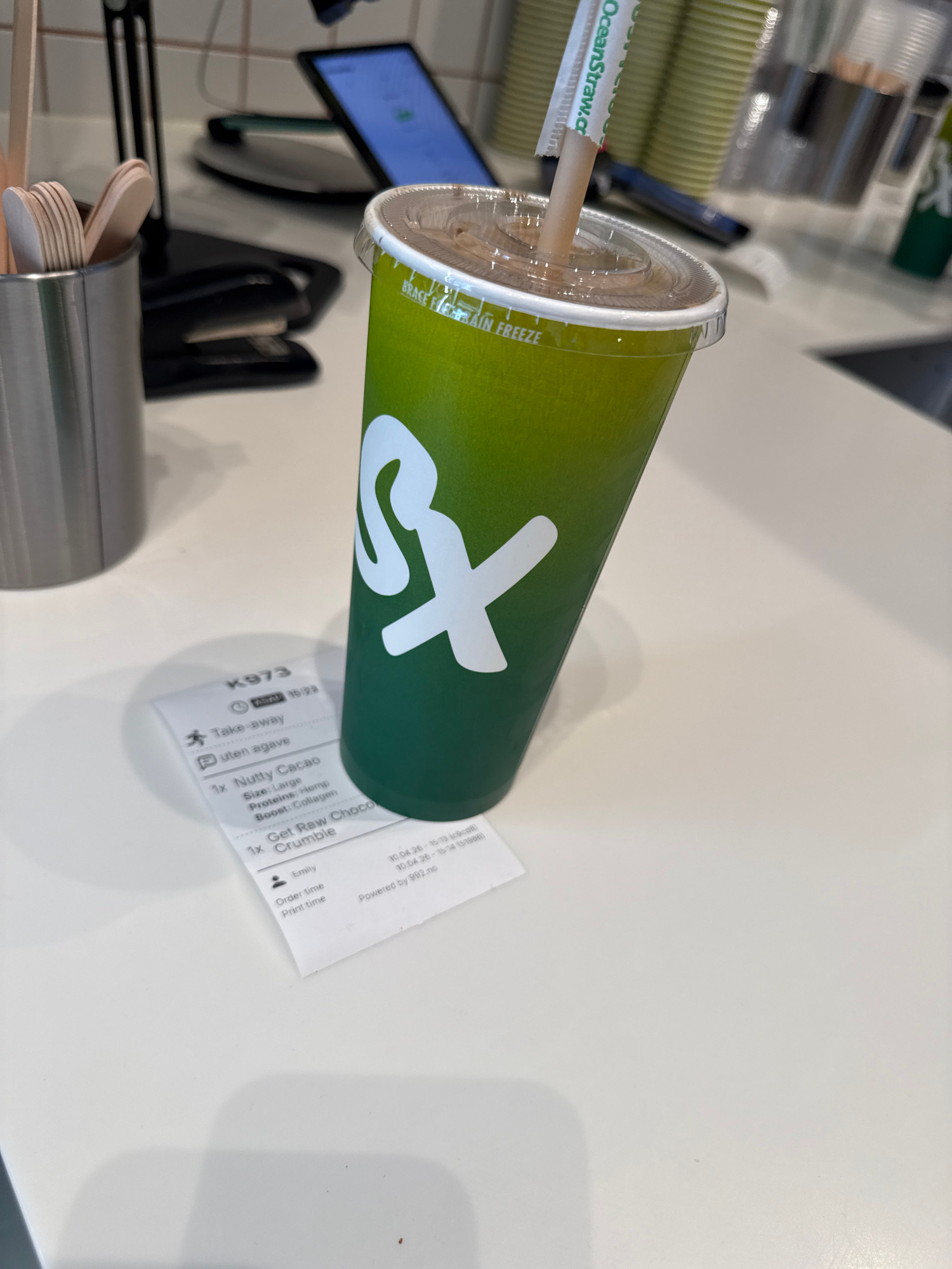 The scene depicts a Jamba Juice cup containing a brown smoothie with an OceanStraw.com straw, resting on a white countertop. Beside it is a receipt indicating the purchase of "Nutty Cacao" and "Gel Ra…read more