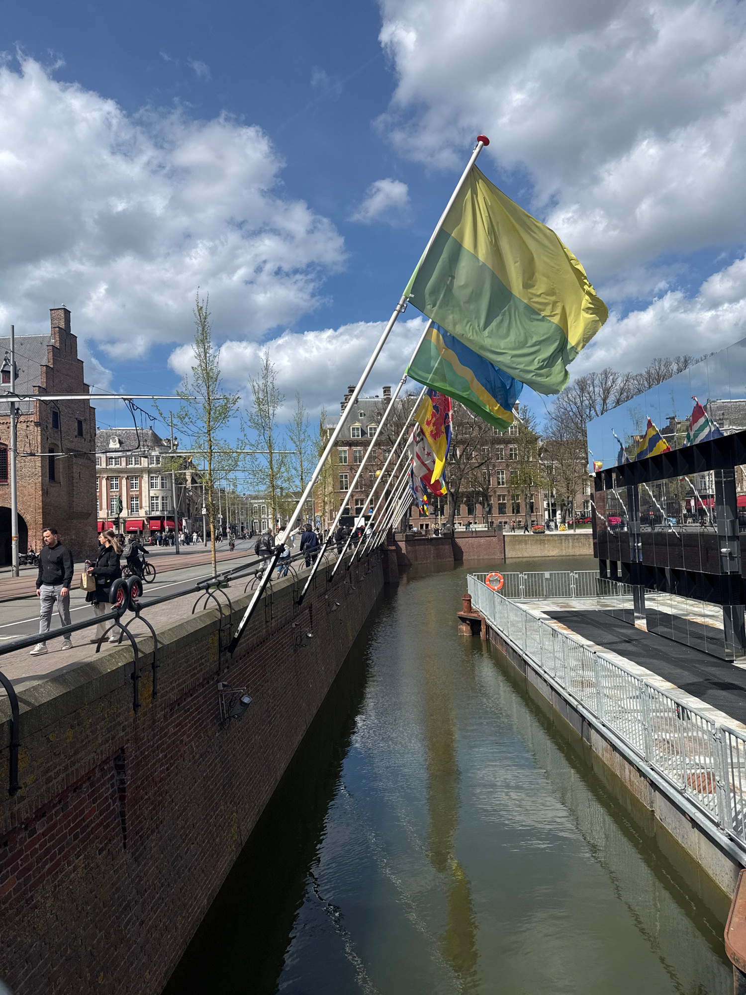 The image shows a view in The Hague, Netherlands, along a canal or waterway. A row of flags on poles lines the brick wall of the waterway. The flags are in different colors and designs. Buildings andβ¦read more