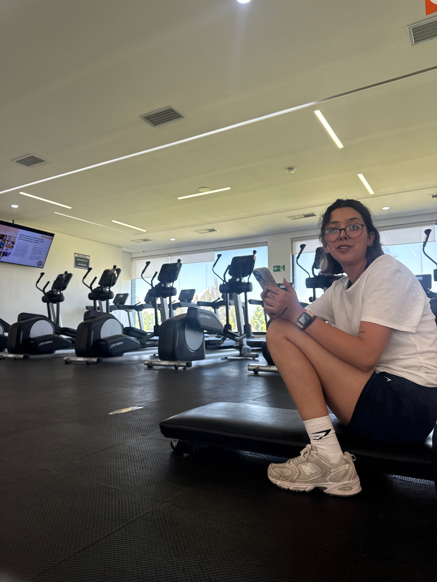 A young woman is sitting on a weight bench in a gym. She is wearing glasses, a white t-shirt, black shorts, white socks, and white sneakers. She is holding a cell phone in her hands. The gym is locate…read more