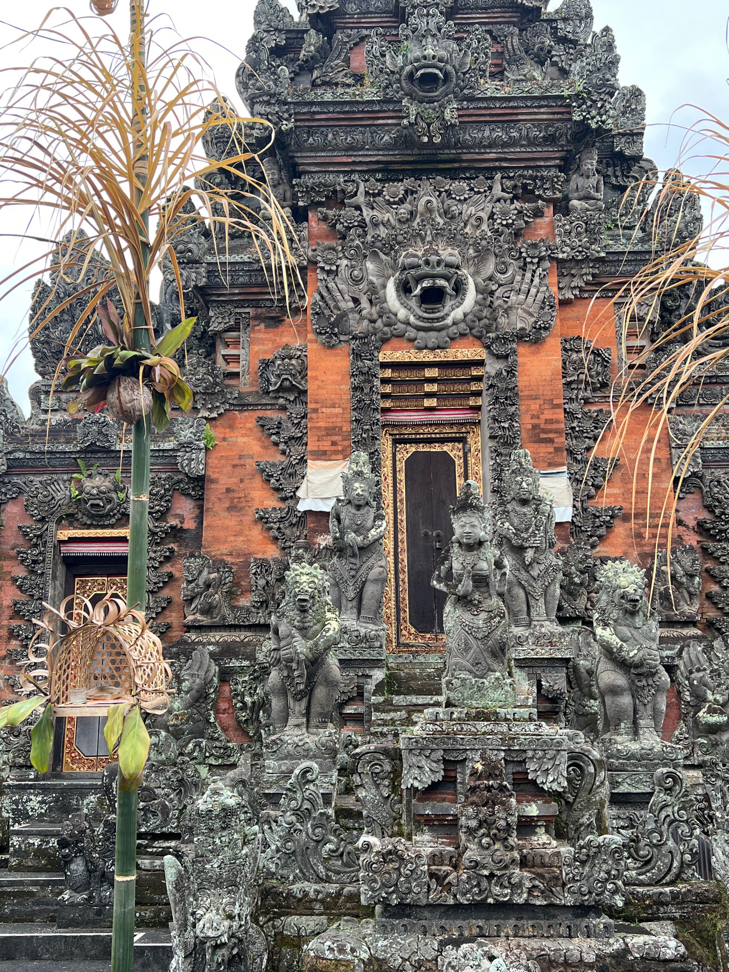 The image displays a richly adorned facade of a traditional Balinese temple or building, located in the Ubud District, Indonesia. The central focus is an intricate wall of dark grey stone carvings, fe…read more