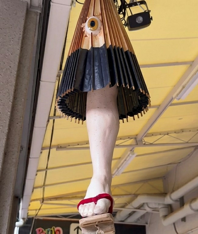 A sculpture depicting a Kasa-obake, a Japanese yokai, is suspended from a ceiling in Kyoto, Japan. The central component is an open, traditional Japanese umbrella (wagasa) with alternating light brown…read more