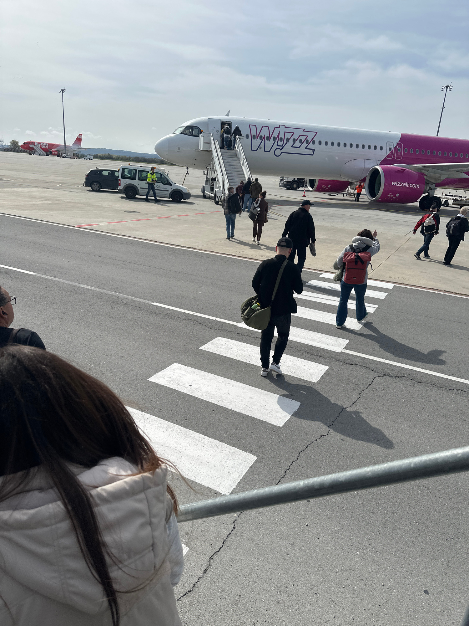 The image shows an airport scene, likely in Aksakovo, Bulgaria. A Wizz Air plane is parked, and passengers are disembarking via a staircase onto the tarmac. People are walking across a crosswalk. In the foreground, part of a person's head and upper body, wearing a light-colored jacket, is visible. Another plane, possibly an EasyJet aircraft, is visible in the distance. The weather appears to be sunny. | Open Wire