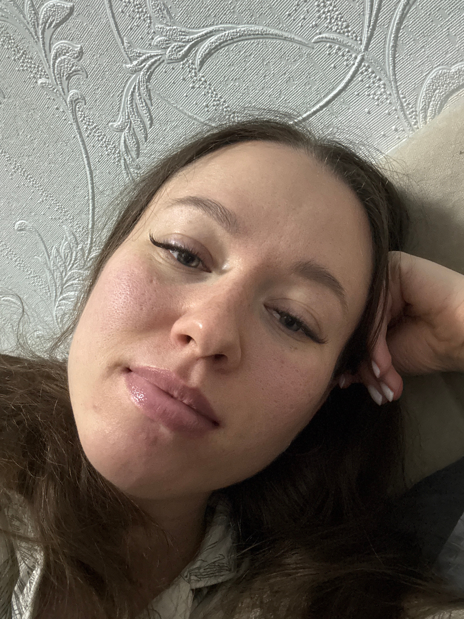 The close-up image, taken from a slightly tilted, overhead perspective, features a young woman reclining indoors. Her head and upper torso are visible, with her dark brown hair fanned out around her.…read more