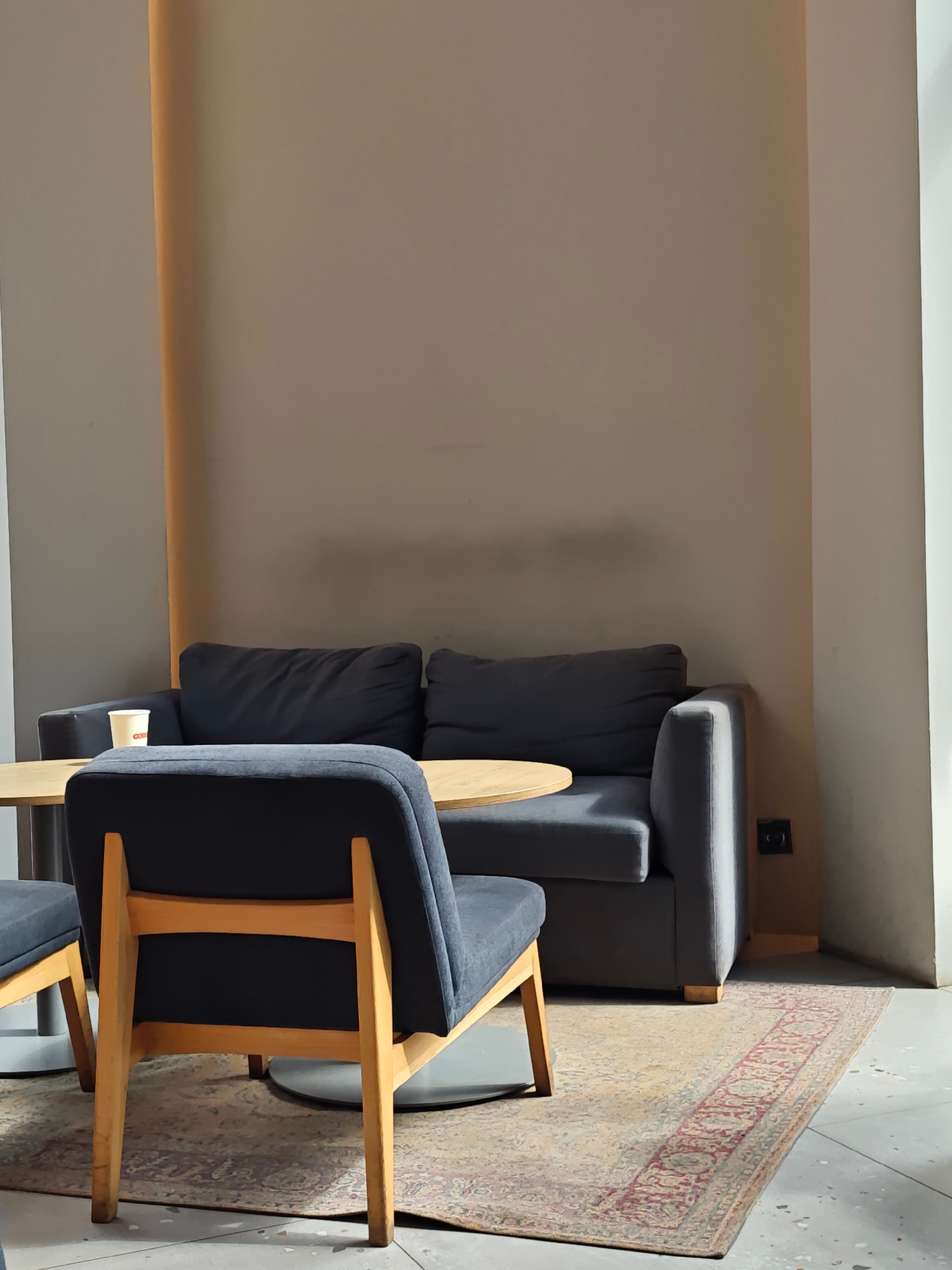 The image shows an interior setting, possibly a cafe or lounge, with neutral-toned walls and natural lighting. A gray two-seater sofa with plump cushions is positioned against the wall. A round wooden…read more
