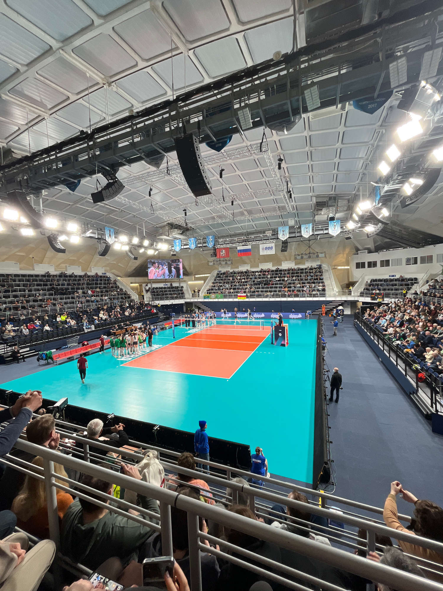 A high-angle, indoor shot captures a volleyball game in progress at what appears to be the Palace of Sports "Dynamo" in Moscow, Russia, given the stadium-like structure and the flags with the word "Mo…read more