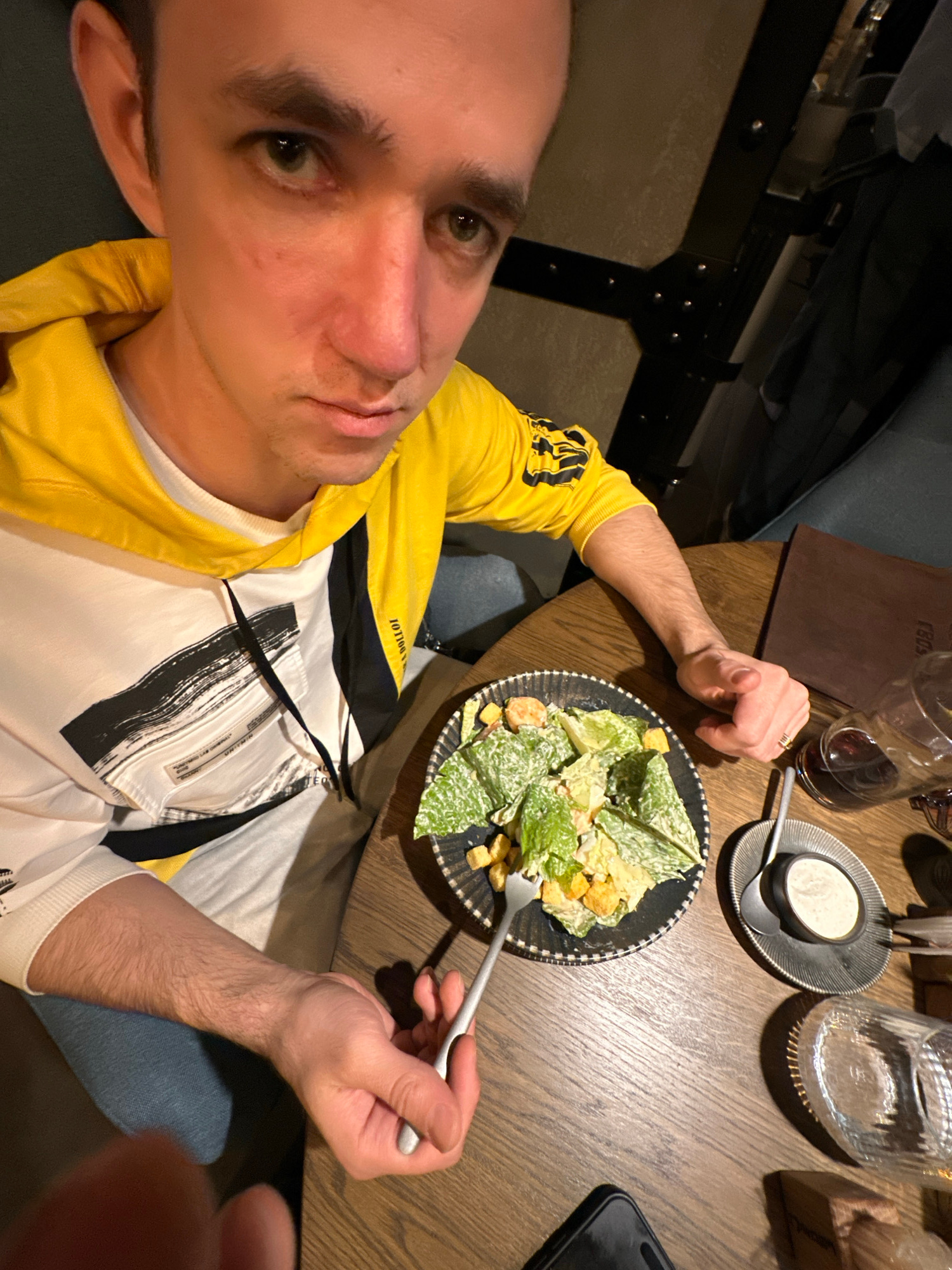 A man is eating a Caesar salad at a wooden table. He is wearing a yellow and white jacket. On the table, there is a glass of red wine, a small dish of dressing, a glass of water, and a cell phone. The…read more