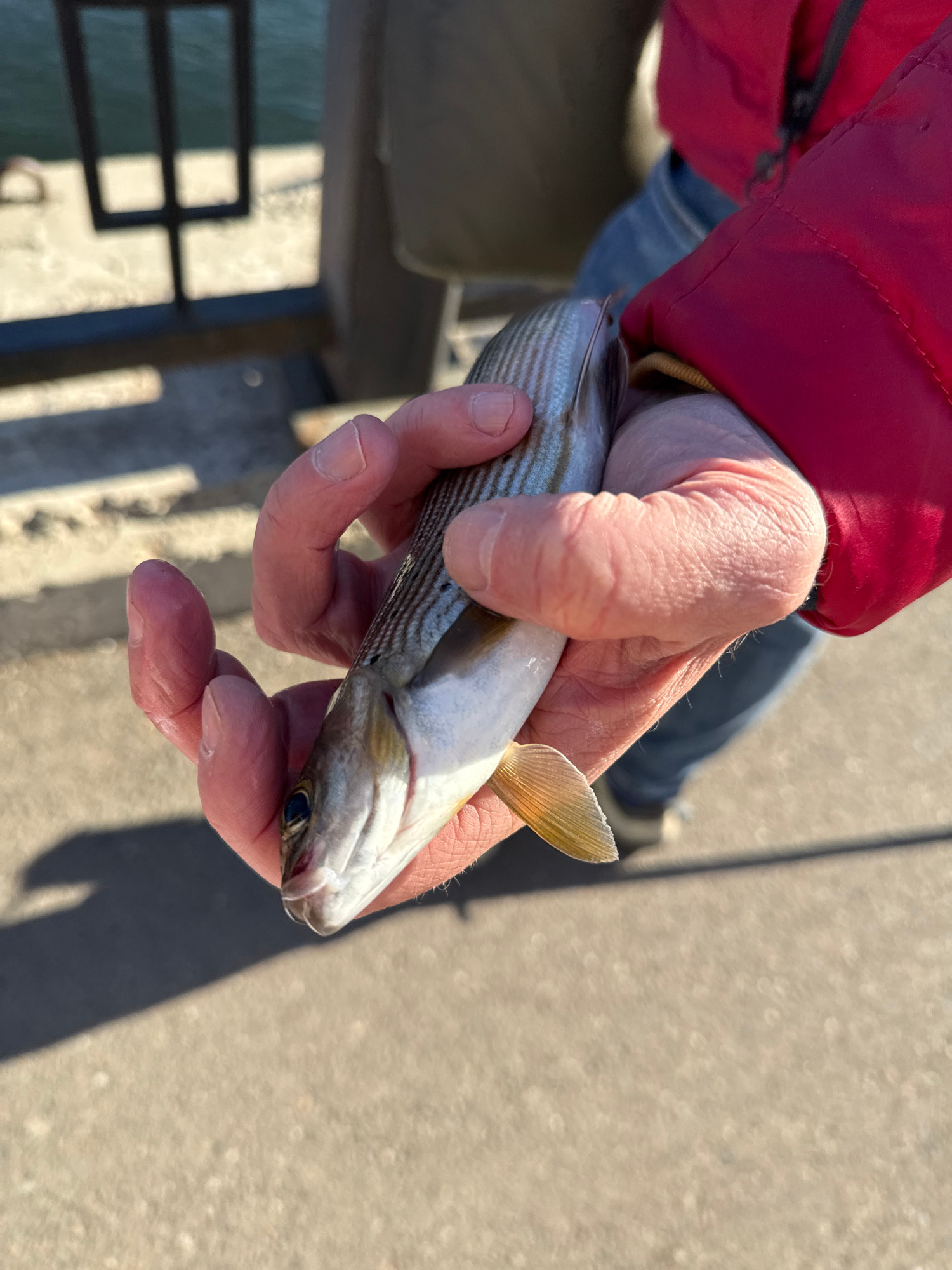 A person is holding a small, silver and white fish in their hand. The person is wearing a red jacket and blue jeans, and they are standing on a paved surface. The background appears to be outdoors. Itβ¦read more