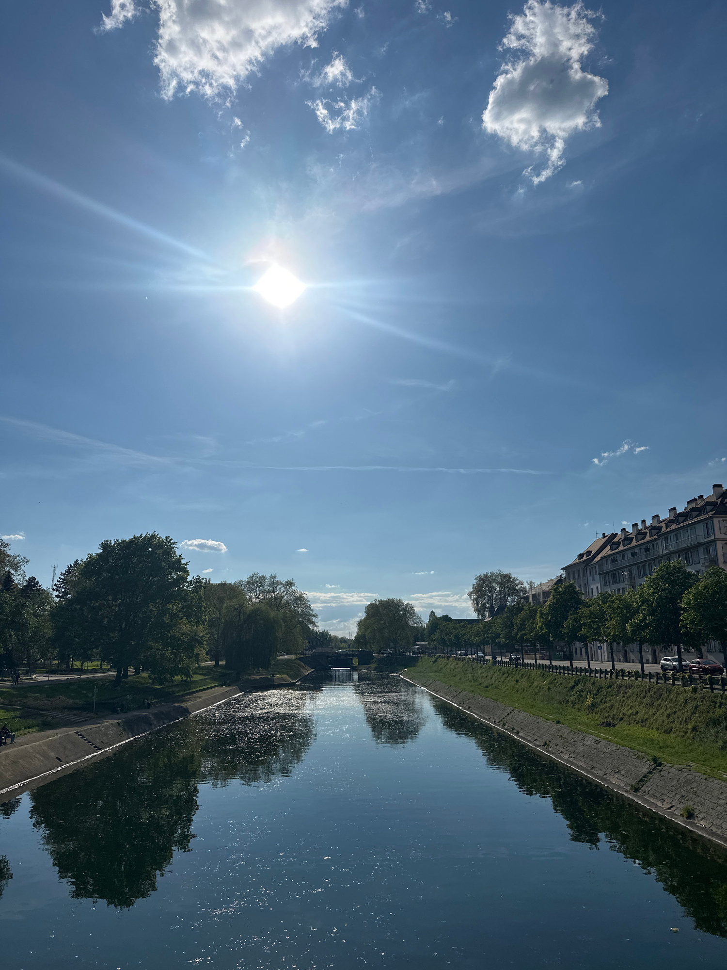 The image captures a canal in Strasbourg, France, on a sunny day. A body of water reflecting the trees, buildings, and sky, runs horizontally across the frame. The sky, a clear blue with some wispy cl…read more