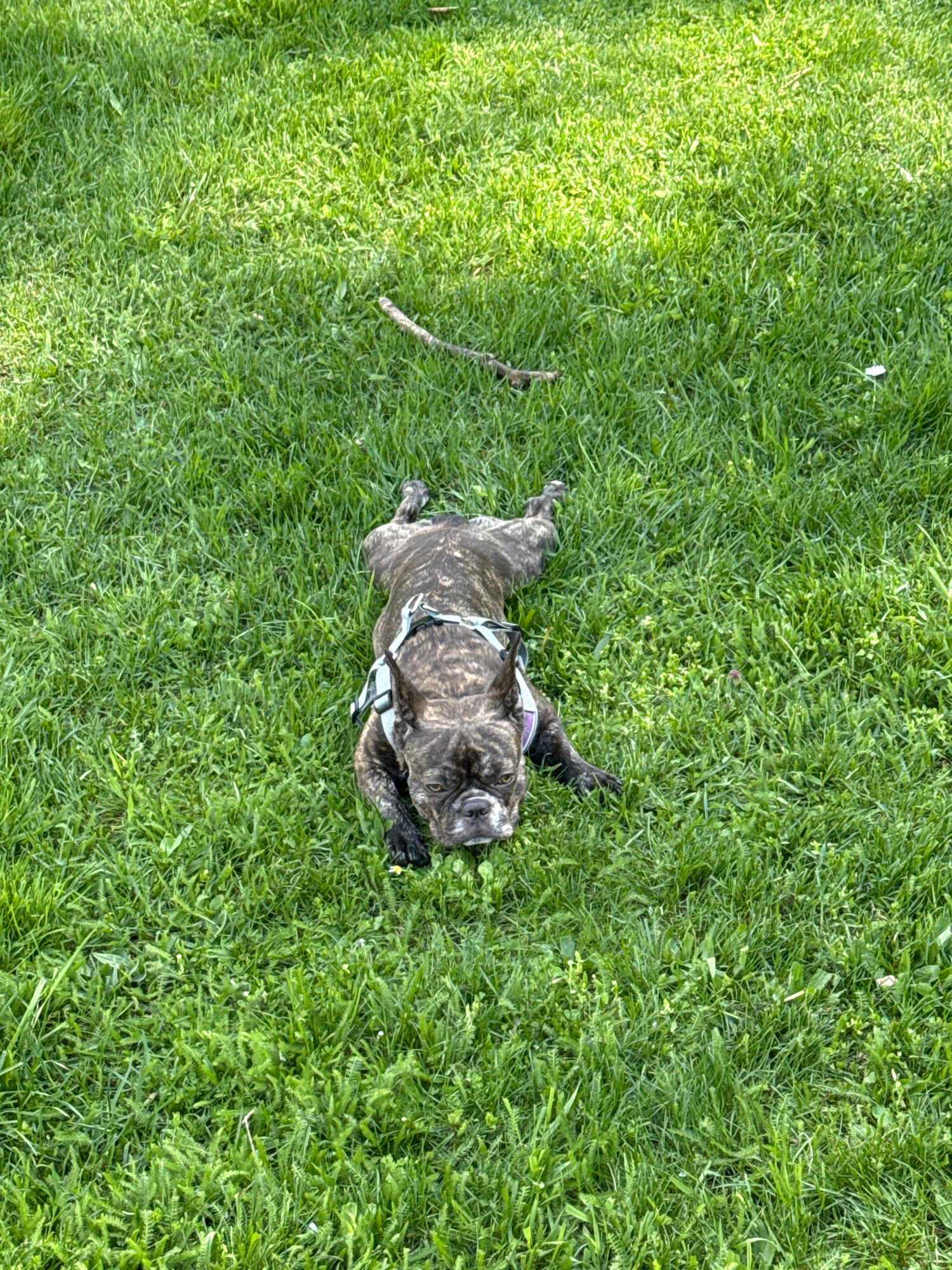 A brindle bulldog with a light-colored harness lies belly-up on green grass. A small stick is nearby on the grass. The location is not discernible from the image.