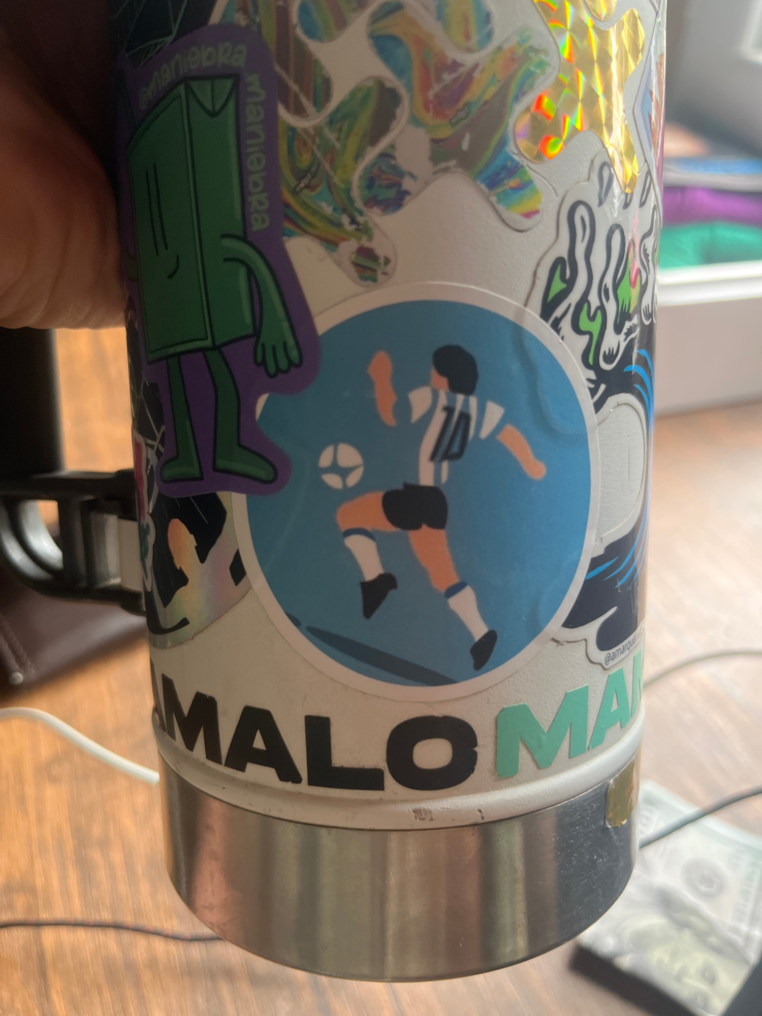 A close-up shows a cylindrical object covered in stickers, likely a water bottle or similar container. One prominent sticker depicts a soccer player in the blue and white stripes of Argentina's nation…read more