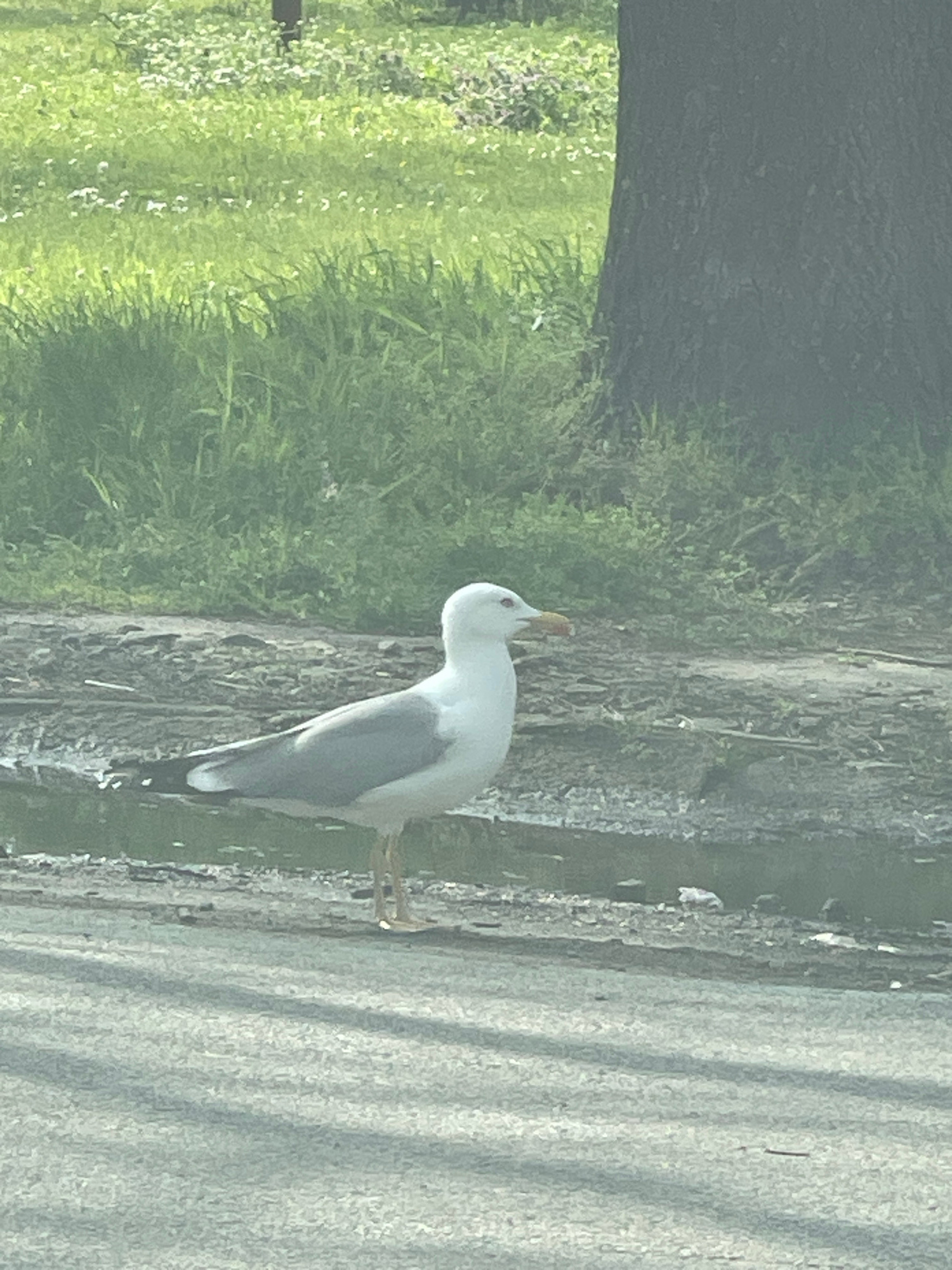 A white bird with grey wings is standing on the edge of a grey pavement next to green vegetation. The location is Burgas, Bulgaria.