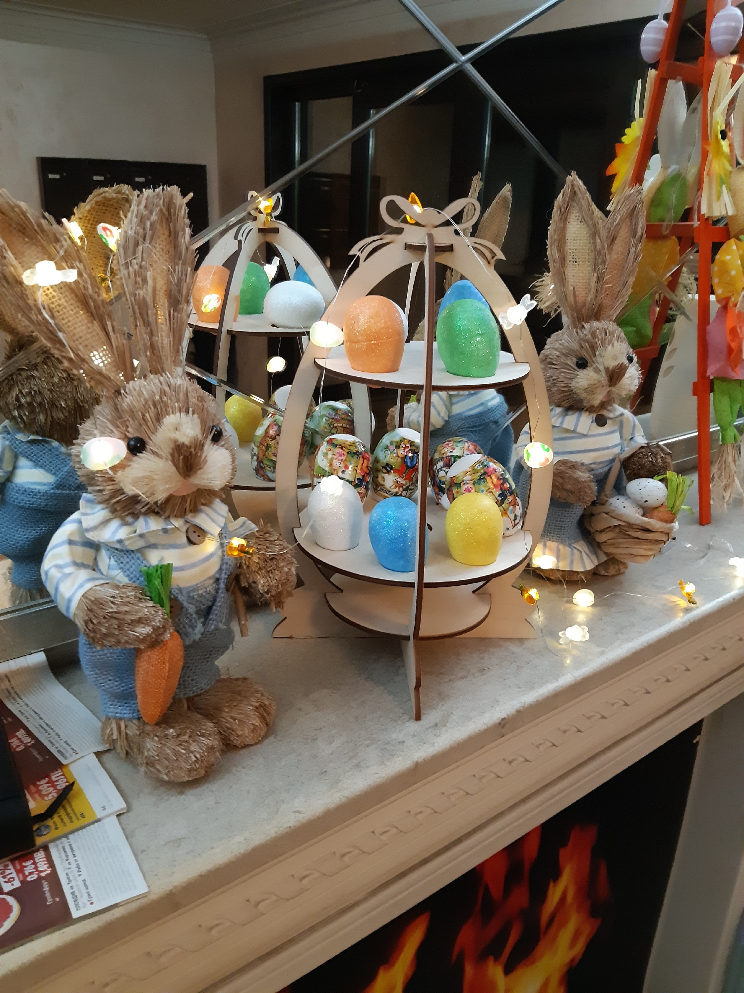 A close-up, slightly rotated image captures an Easter display. A wooden egg-shaped stand holds various colorful eggs. The stand is adorned with small lights. Adjacent to the stand are two stuffed bunn…read more