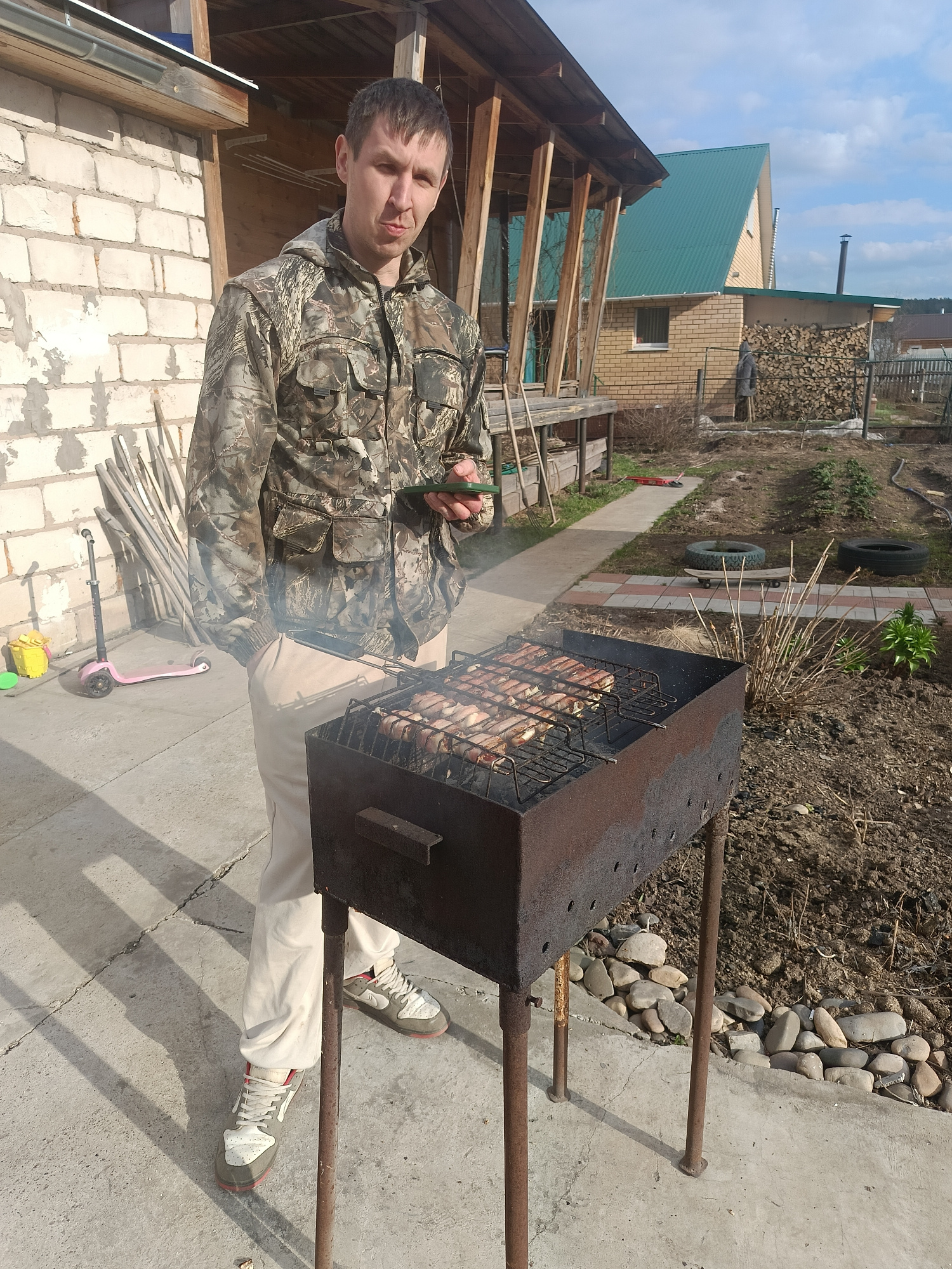 A man in a camouflage hooded jacket, light-colored pants, and grey and white sneakers stands by a rustic, dark metal grill (mangal) where pieces of meat are cooking on a grate, emitting smoke. He hold…read more