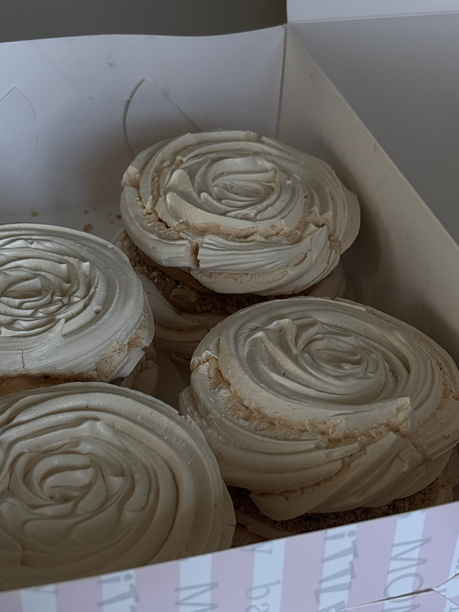 The image shows a close-up, high-angle view of four beige-colored, rose-shaped meringue cookies arranged in a white cardboard box. The box has pink and white striped text on its side. The meringues ar…read more