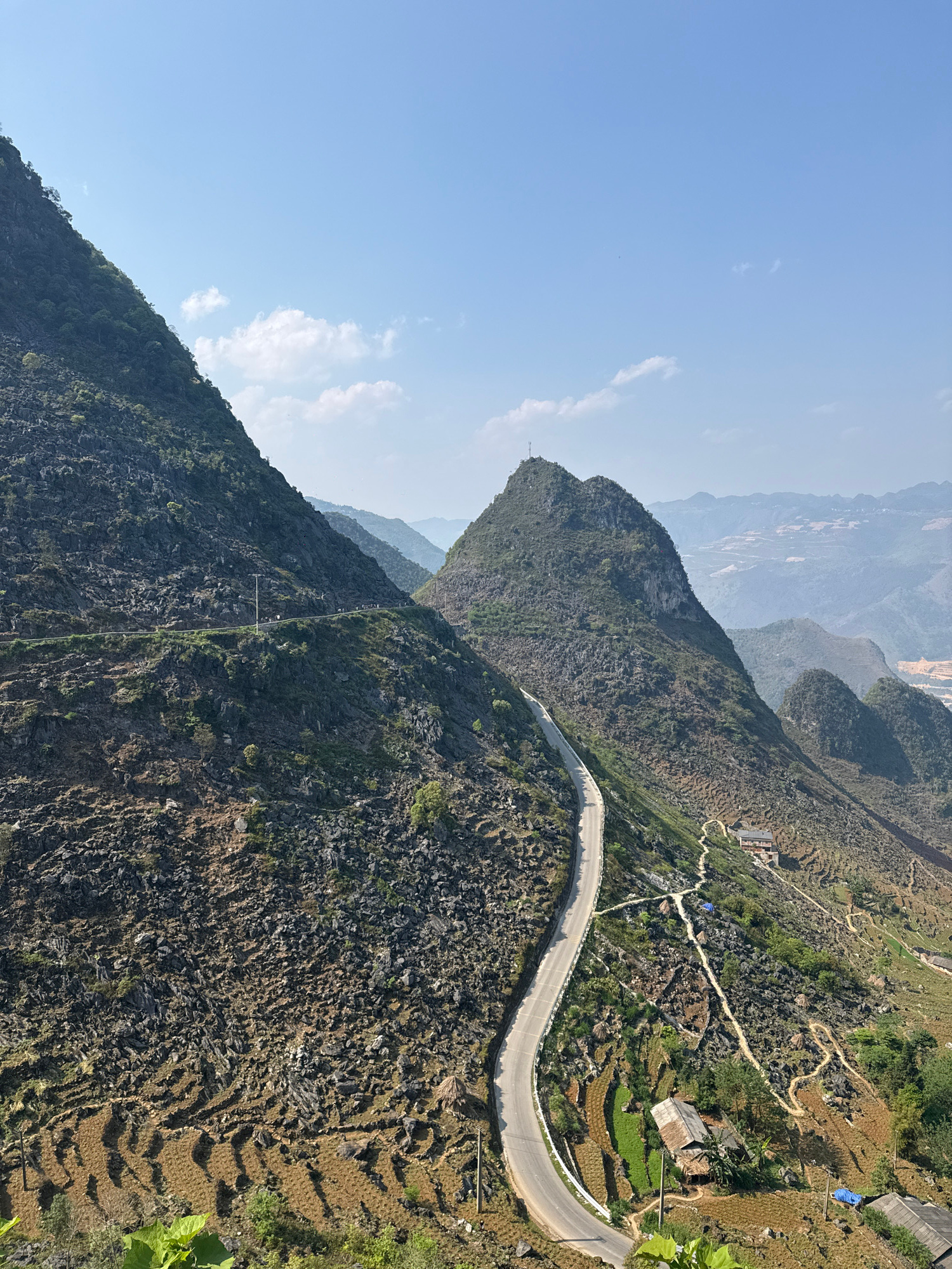 The image depicts a mountainous landscape in Đồng Văn Commune, Vietnam. A winding paved road with a white barrier snakes along the side of a steep, rocky mountain. The mountain is sparsely vegetated w…read more