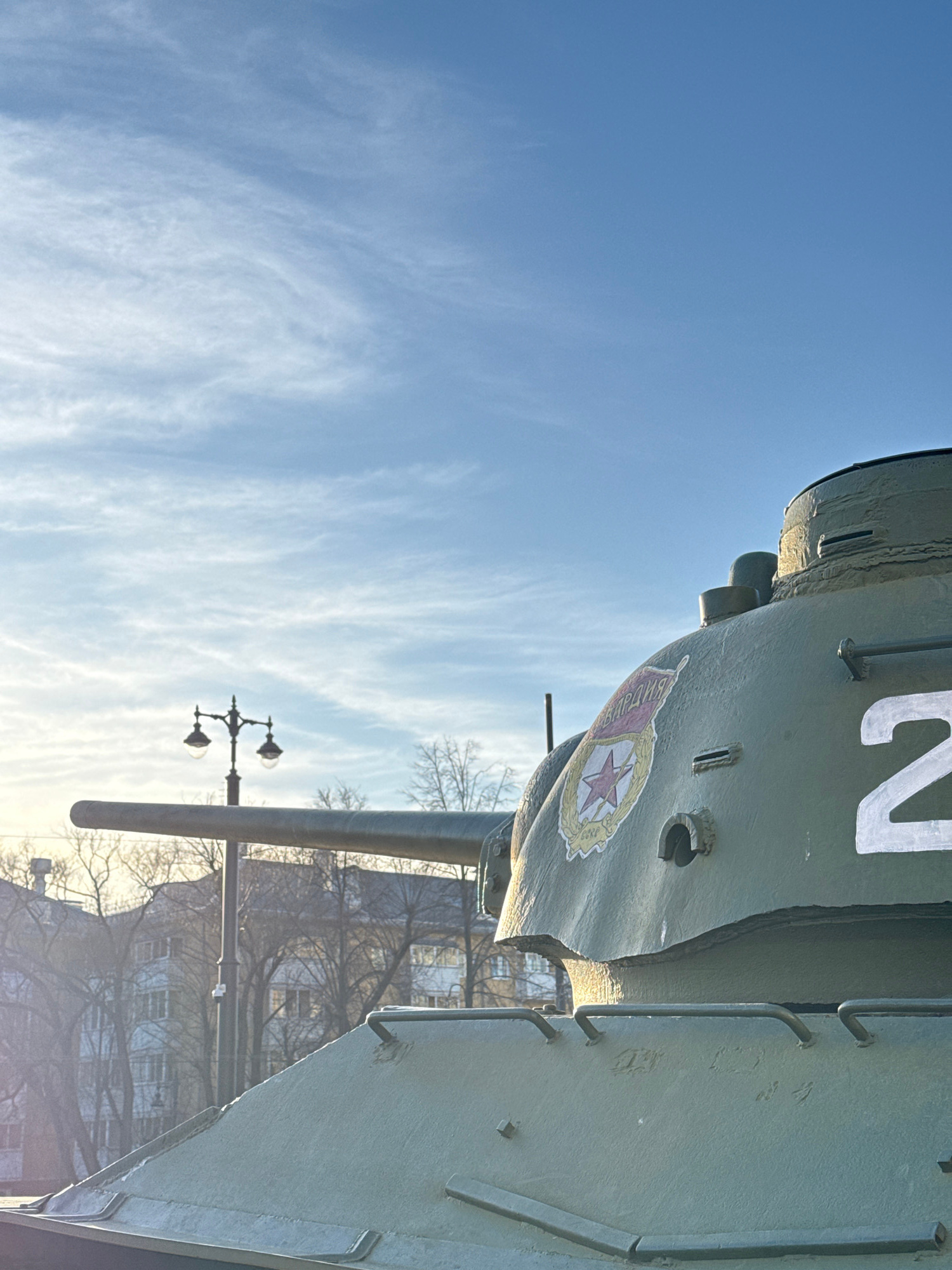 The scene is set outdoors in Perm, Russia. The primary subject is an olive-green military tank, viewed from its front-right quarter at a low angle. The tank's turret features a white numeral "2" and a…read more