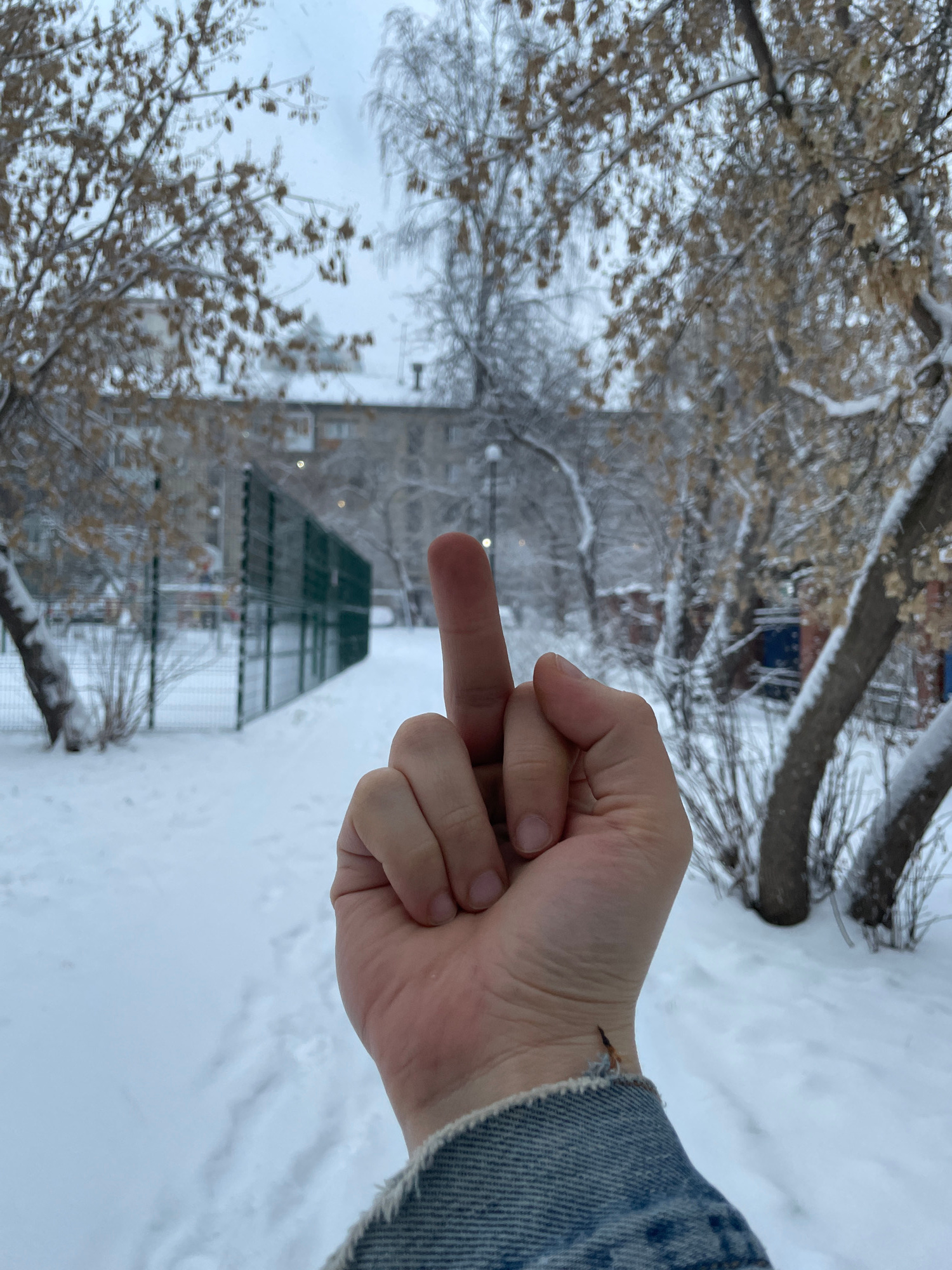A person extends a middle finger in front of a snowy scene. Bare trees and snow-covered ground dominate the background. Behind the trees, indistinct buildings can be seen. The scene appears to be a sn…read more